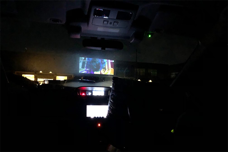 ドライブインシアターは、駐車場に巨大スクリーンを設置し、車に乗ったまま映画を鑑賞する…というもの。