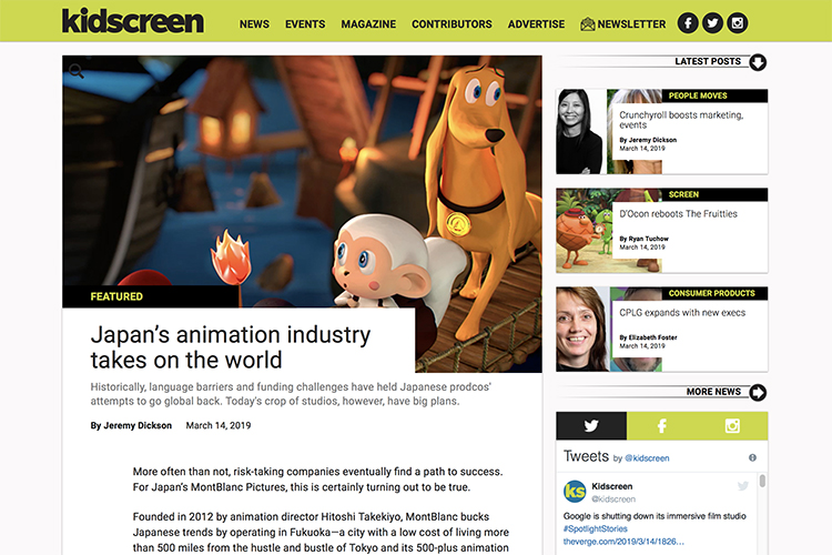 アニメーション業界誌「Kidscreen」に掲載されましたMar 15, 2019Media世界のアニメーション業界誌トップクラスの「Kidscreen」の特集記事で弊社モンブラン・ピクチャーズの海外展開について「チャドとクラーク」を事例に取り上げていただきました。記事は「Kidscreen」web版からご覧いただけます!■FEATURED – Japan’s animation industry takes on the world■「チャドとクラーク」最新ティザームービー