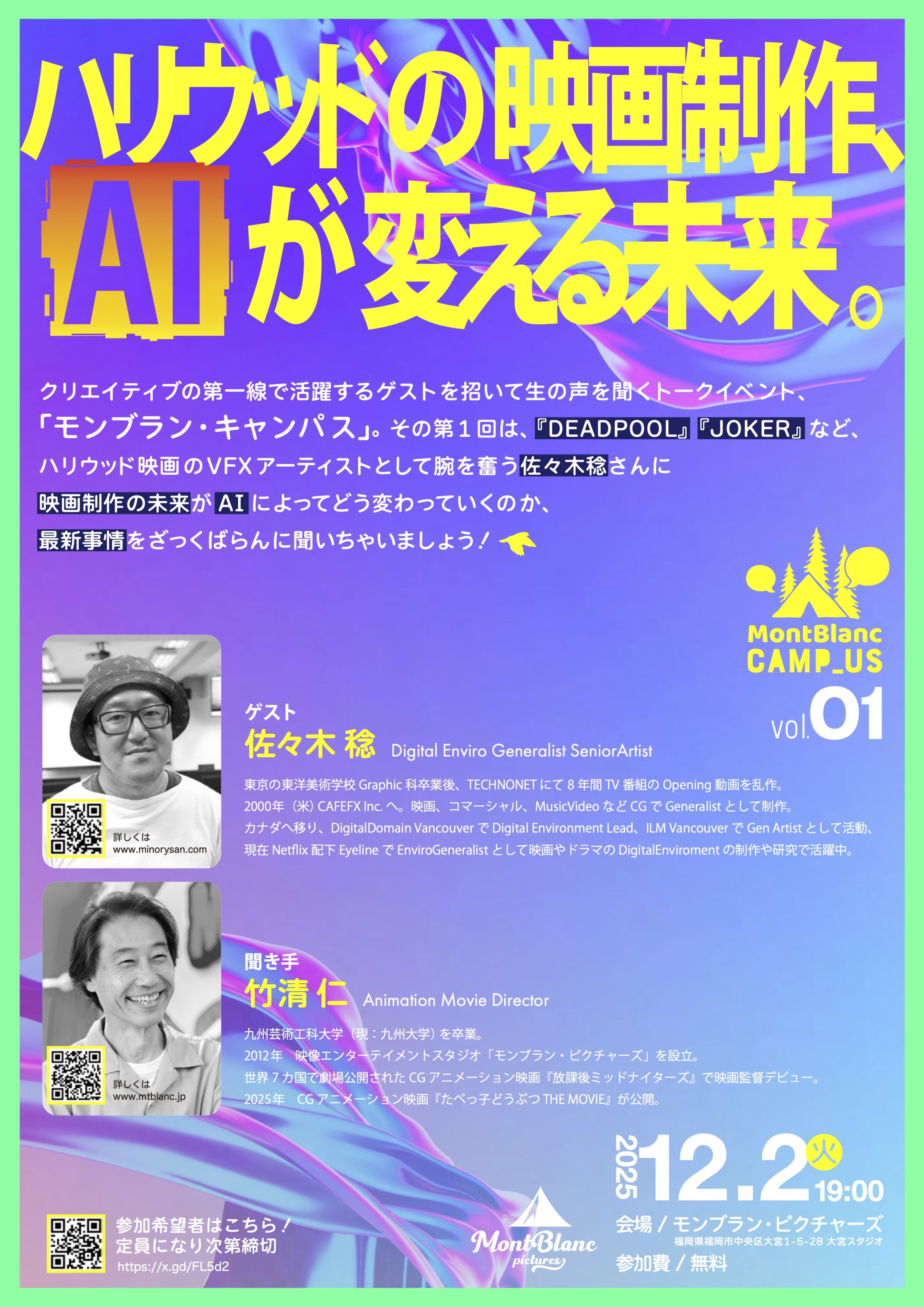 そんなモンブランが新しくお届けするのが、クリエイティブ業界の第一線で活躍するゲストを迎え、リアルな制作現場の今を語るトークイベント「MontBlanc CAMP_US(モンブラン・キャンパス)」です!福岡にあるモンブランピクチャーズだからこそできる、長年温めてきた企画が新しいスタジオでいよいよ始動します!!