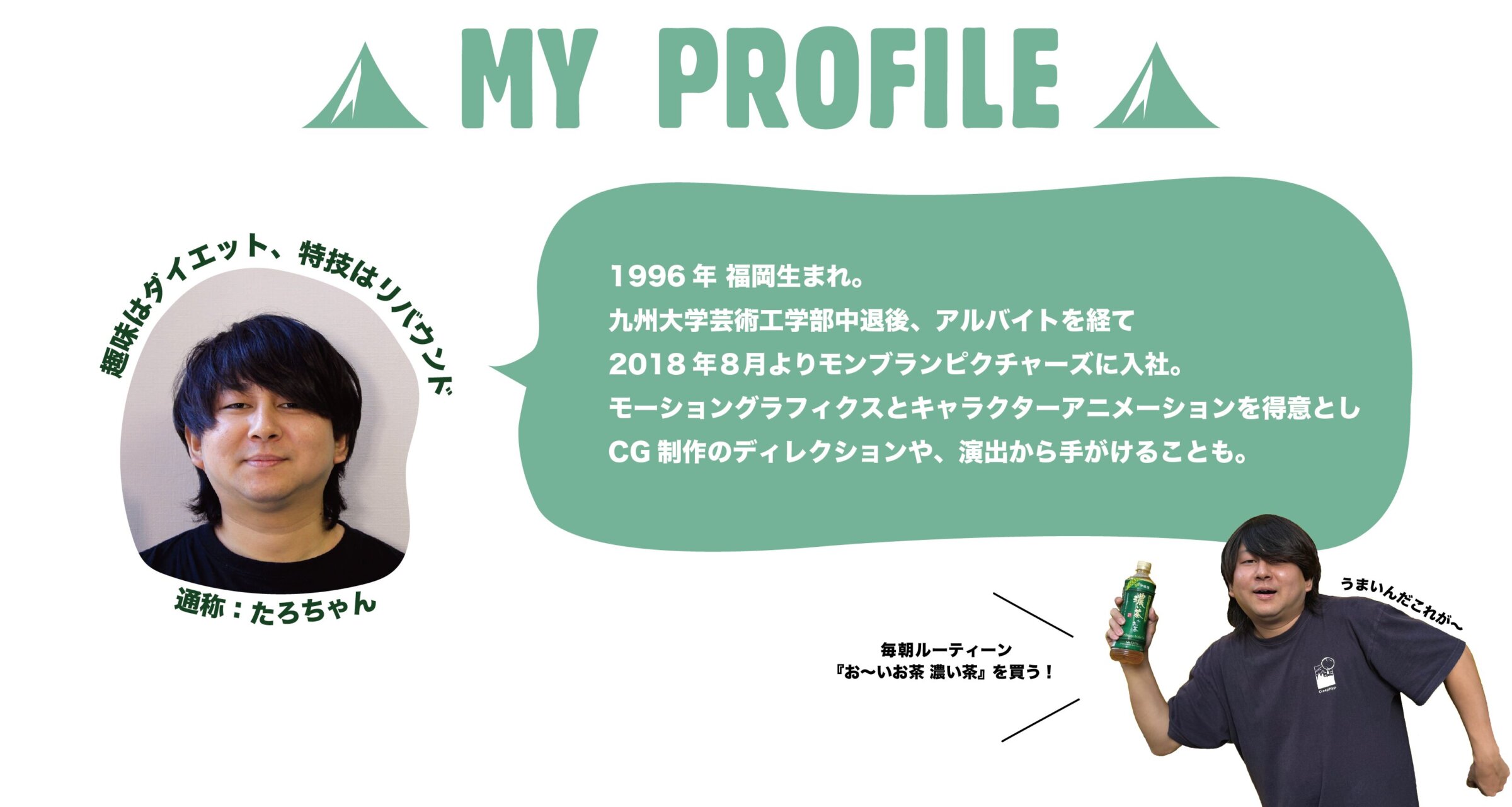 太朗 特徴… そうですね〜色々やらせてもらえる、とかかな。例えば、他の会社さんだったら、アニメーターとして就職したら、ずっとアニメーションだけをやる体制が多いなか、あ、それが良いとか悪いとかっていう話ではまったくないんですけど、そういう体制の会社さんもあるなかで、モンブランはアニメもやりたいけど、他のこともやりたいっていう人に対して寛大な会社なので、そこは特徴なんじゃないかと思いますね。
