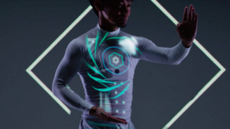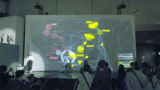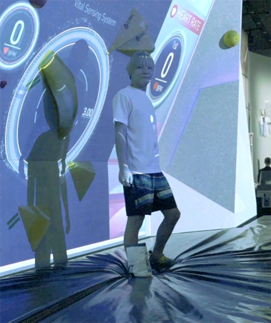 選手の肌の色のわずかな変化から血流を読み取り、心拍数を測定することができる「コンタクトレスバイタルセンシング」を組み合わせ、競技中の選手の動きや身体データに合わせてリアルタイムに映像が変化するステージ演出を行なっています。