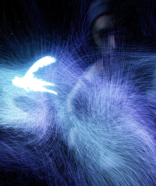 本作品のために書き下ろした墨絵の上に、墨絵制作時の詳細な体の動きのデータを基に制作した映像を