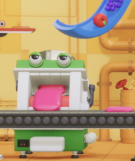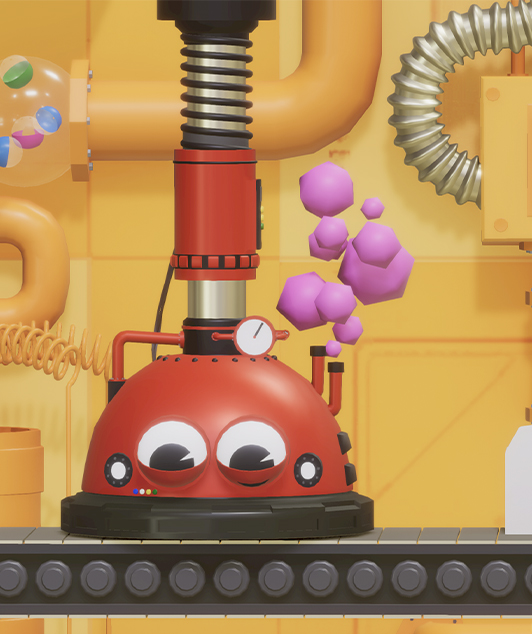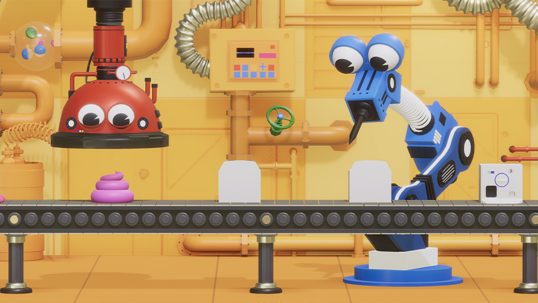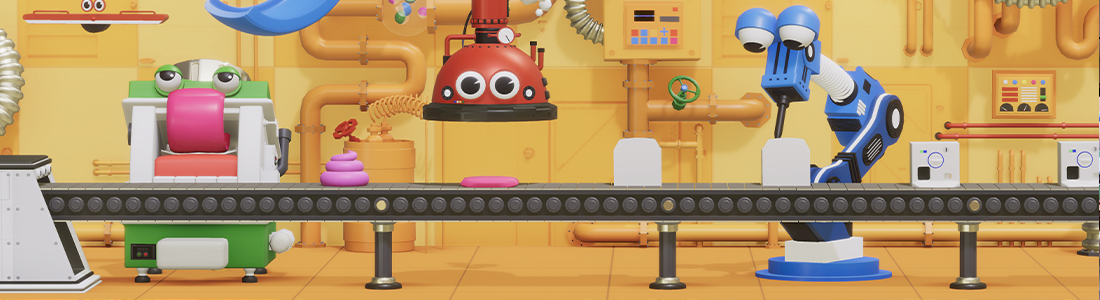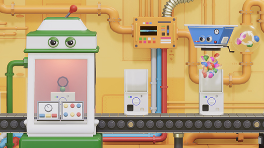 “ガシャポン組立工場” をイメージして、キャラクター化されたロボットたちが筐体を組み立てていく様子を