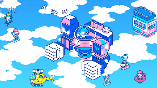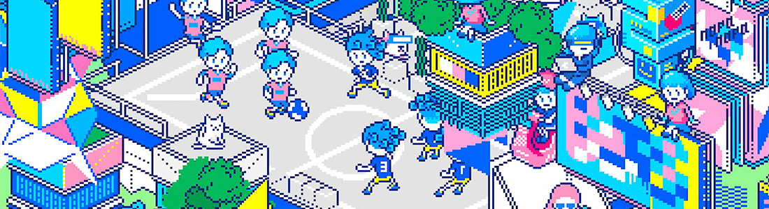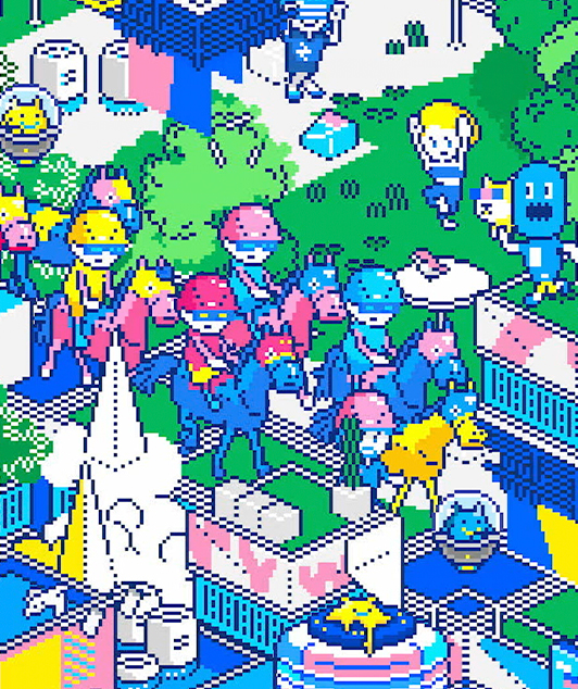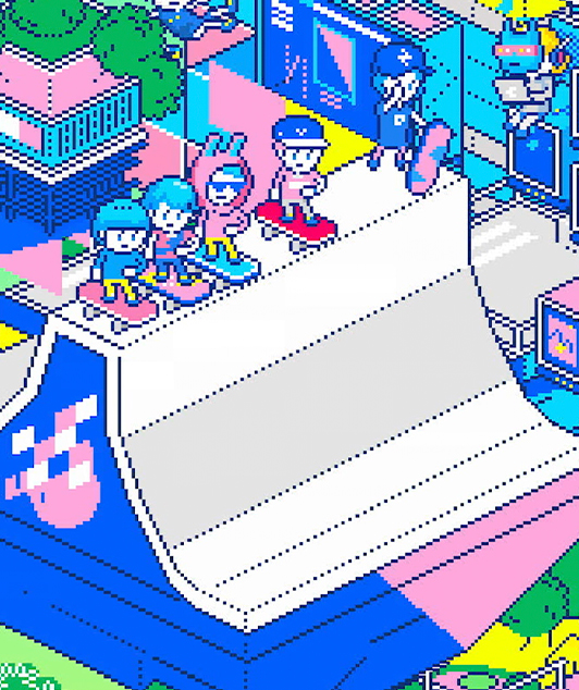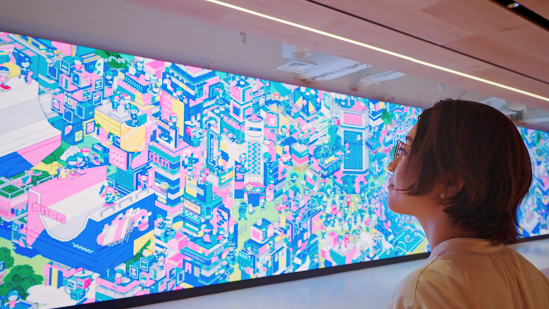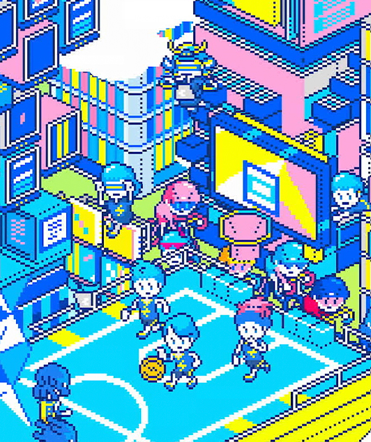様々なものが融合する未来の渋谷を、懐かしさと先進性を併せ持つドット画アニメーションで表現。
