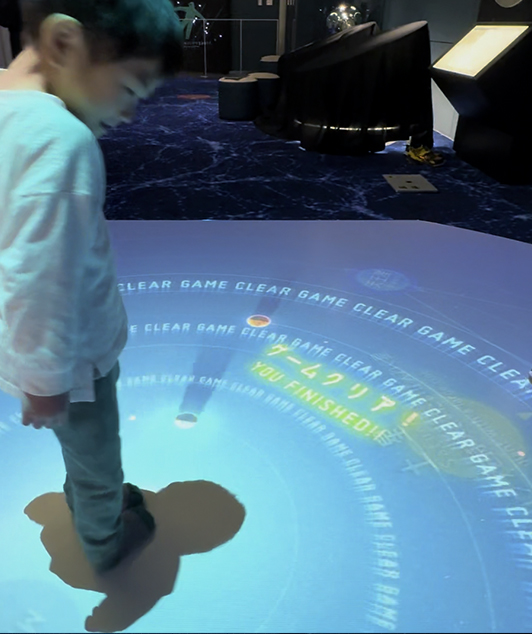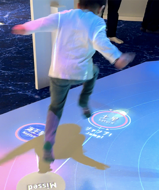 直径3.6mの床面スクリーンに映し出された太陽系の上をぴょんぴょん飛びまわって遊ぶ体験型展示です。