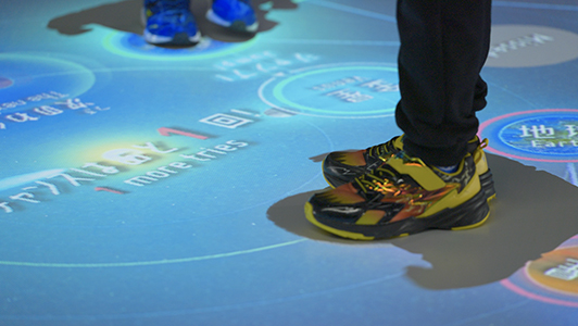 Planets Hopper is an interactive exhibit where visitors can jump around on the solar system projected on a 3.6-meter-diameter floor screen.