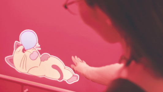 スロープの壁面に黒猫のジジが現れ、来館者を黒猫シアターへと誘います。