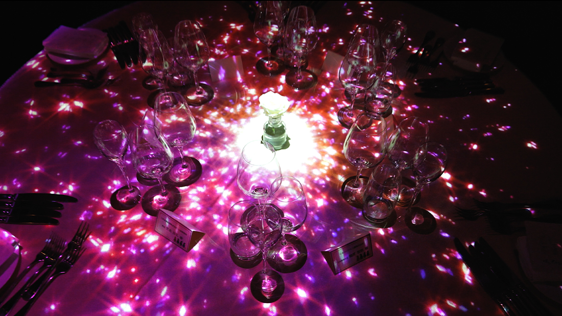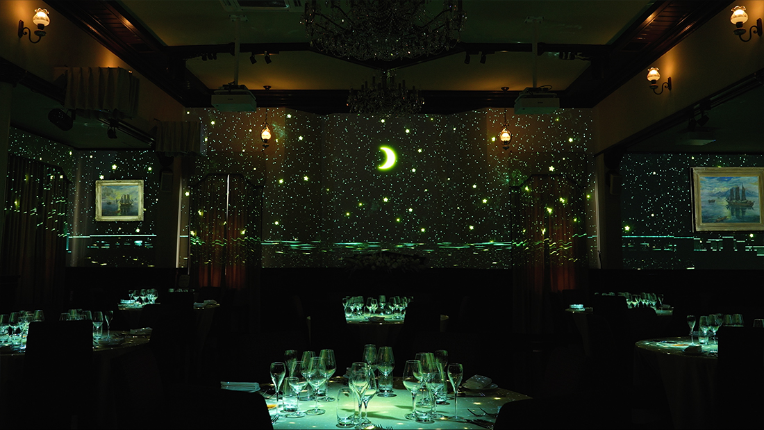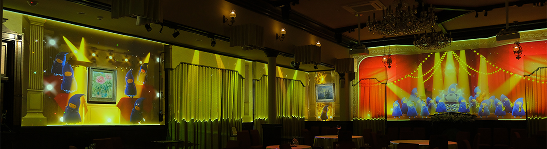 三井港倶楽部で一番広い「有明の間」をキャンバスに見立て、360度すべての壁とテーブルに映像を投影します。