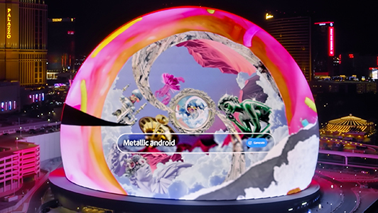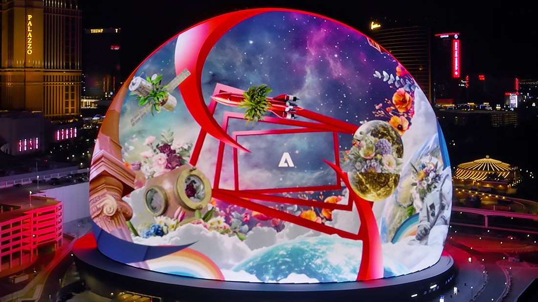 「Adobe Summit 2025」の会期中、開催地ラスベガスのランドマークである「Sphere」の世界最大の球体型LEDに投影された、3つのAdobeの広告映像。