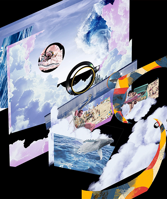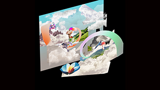 「Adobe Firefly」をアイデアソースに、クリエイターがアドビのツールを使って世界を広げていくという企画で、「Collage World」ではコラージュされた絵の世界を、一定のスピードで突き抜けていくような構成に