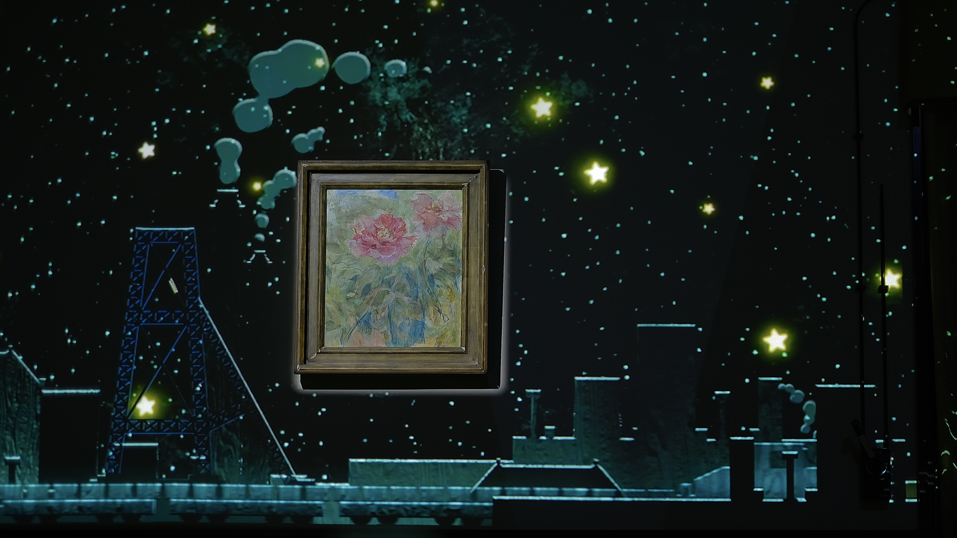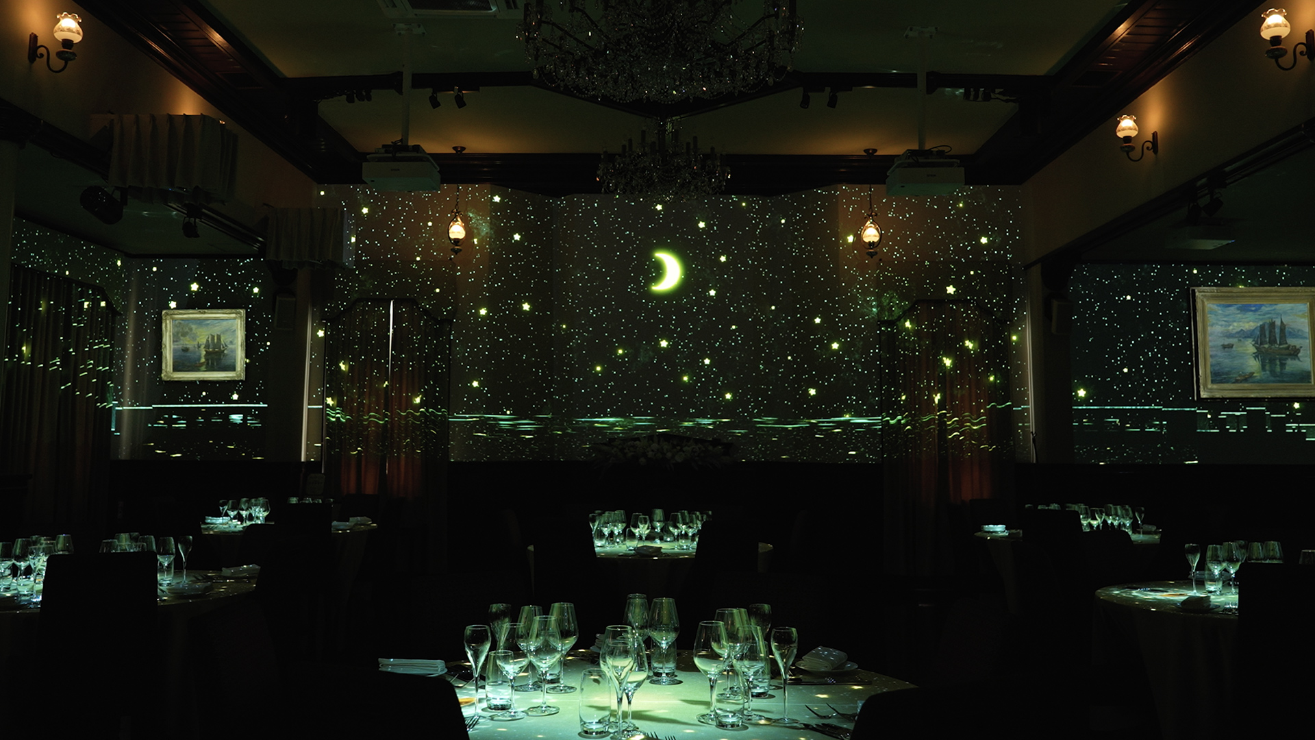 三井港倶楽部で一番広い「有明の間」をキャンバスに見立て、360度すべての壁とテーブルに映像を投影します。