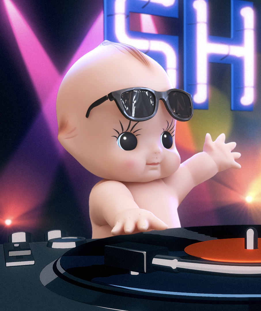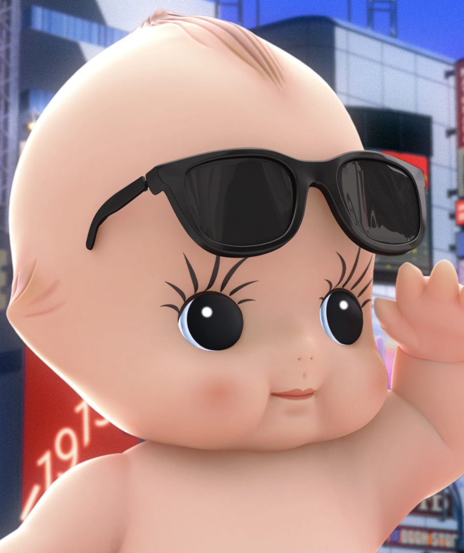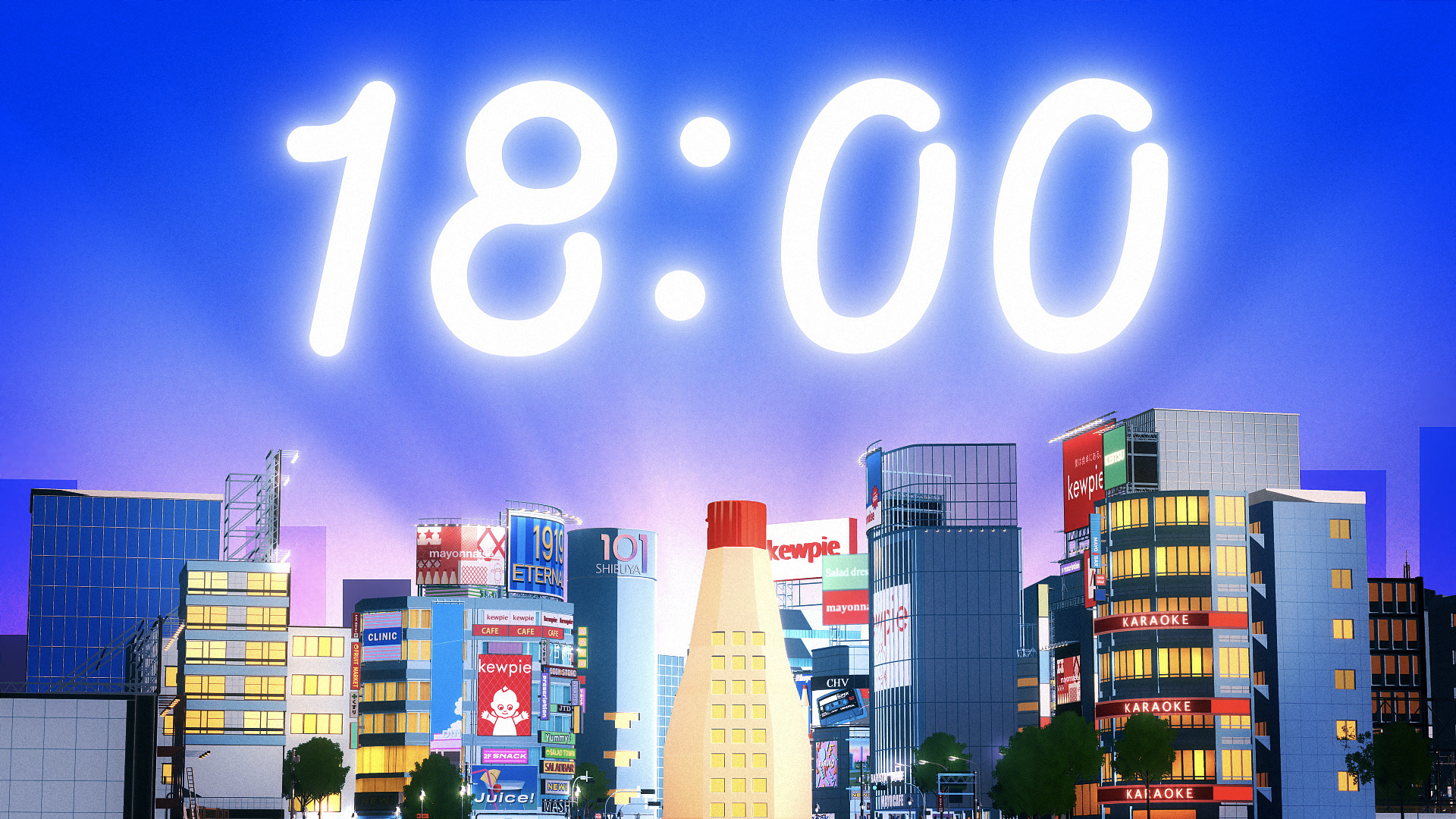 渋谷駅ハチ公口スクランブル交差点の4つの屋外ビジョンに映し出される映像コンテンツ。「SHIBUYA POP」をテーマに、18:00の時刻をお知らせしています。モンブランでは、キユーピーのキャラ制作、背景を含めたルックの作成を担当しました。