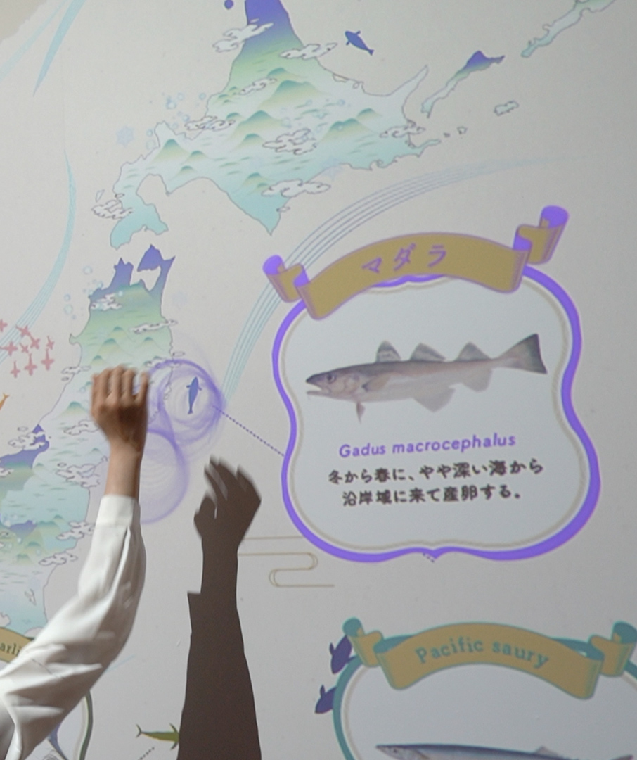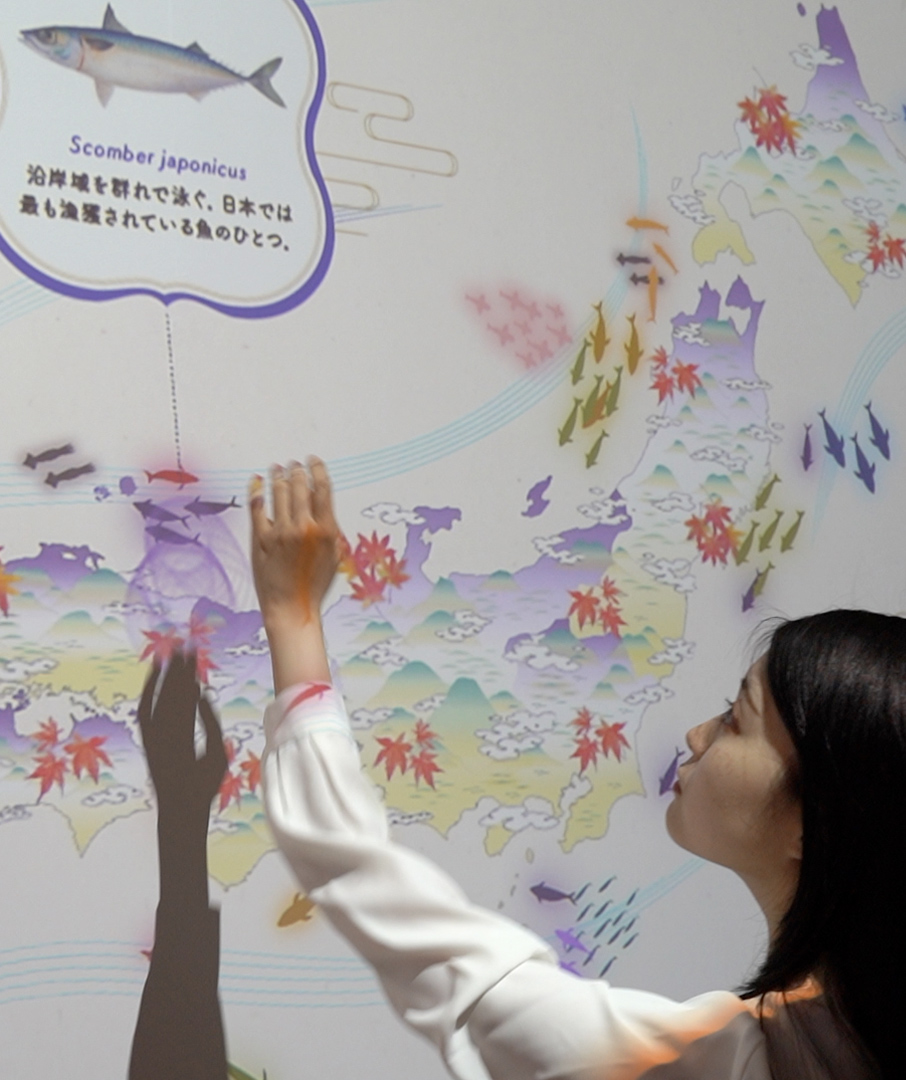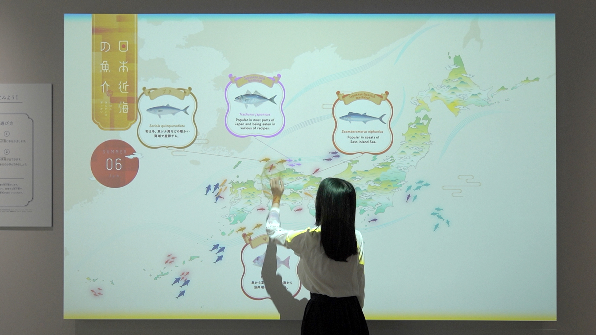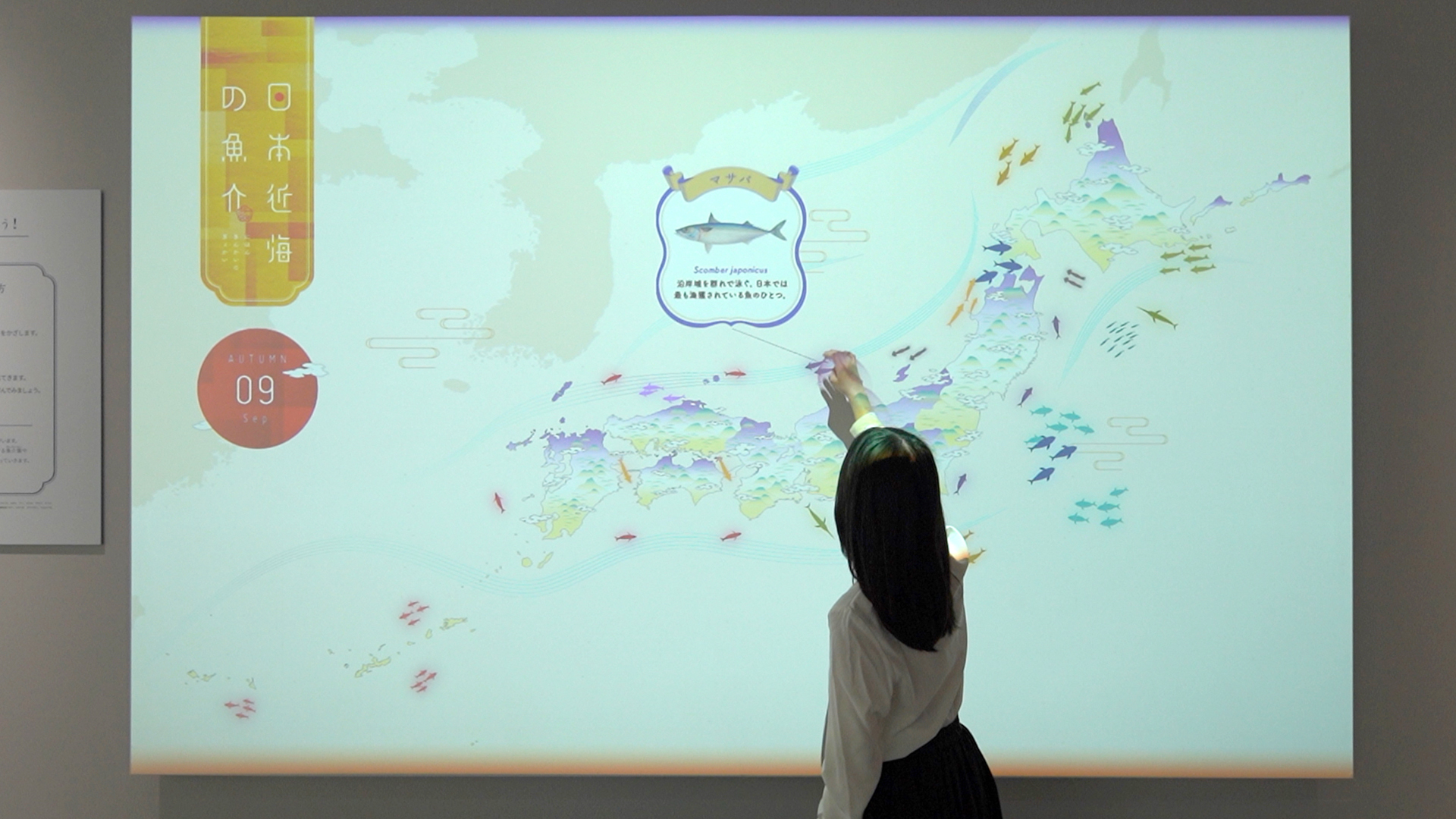 季節とともに移り変わる日本列島の周囲には、その季節に合わせた魚のシルエットが回遊し、シルエットに手をかざすと、イラストとともにその魚の名前や特徴が表示されます。