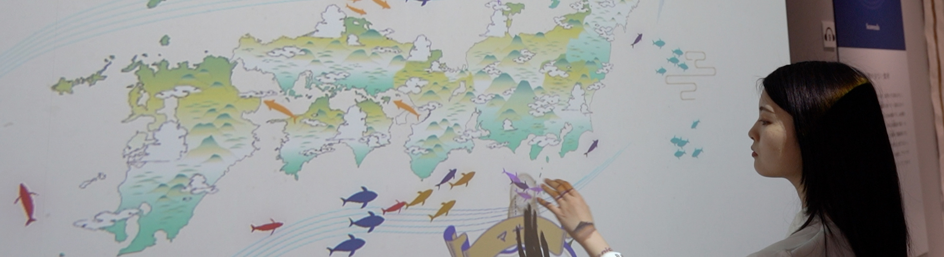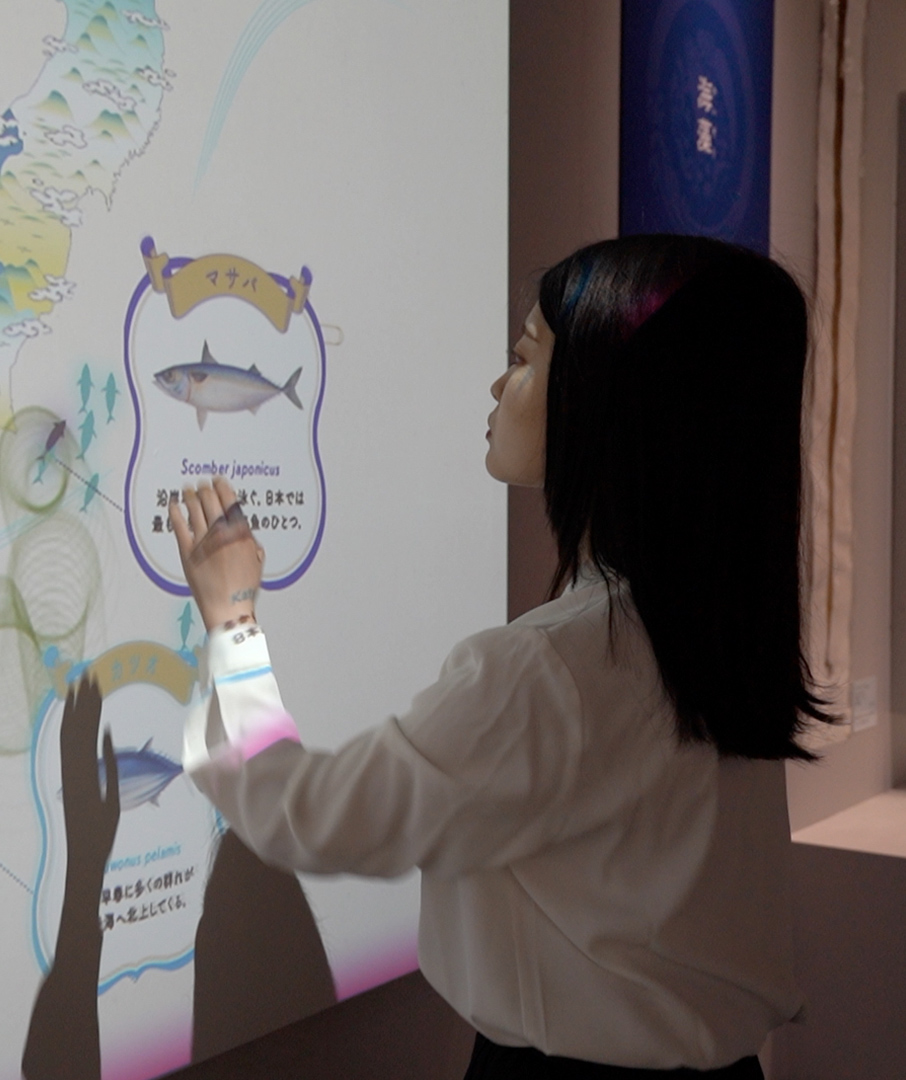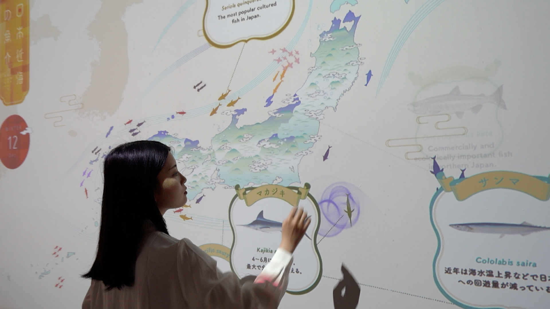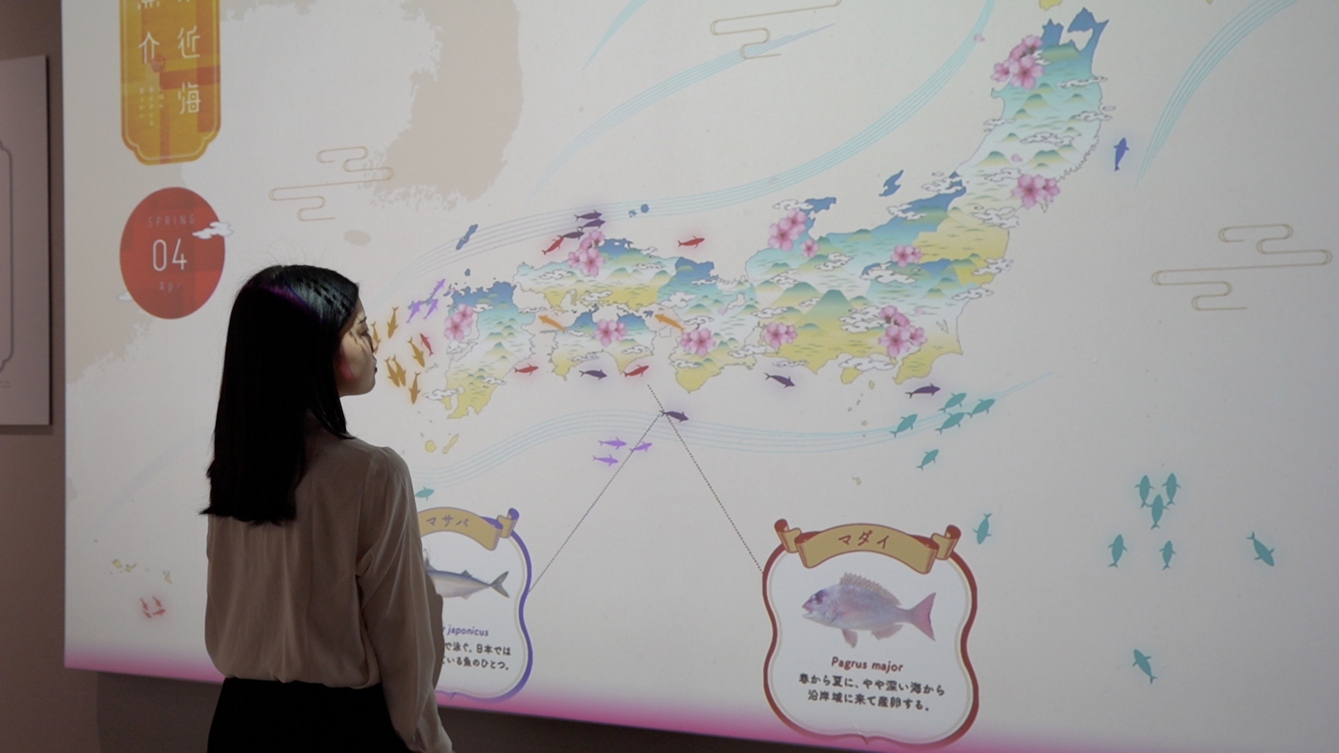 季節とともに移り変わる日本列島の周囲には、その季節に合わせた魚のシルエットが回遊し、シルエットに手をかざすと、イラストとともにその魚の名前や特徴が表示されます。