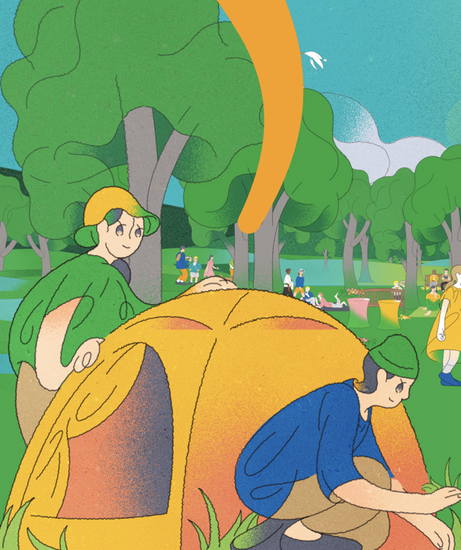 MIXIがエモーションとコミュニケーションで人々をつなげていき、世界中をワクワクや笑顔で満たしていく様子を描きました。
