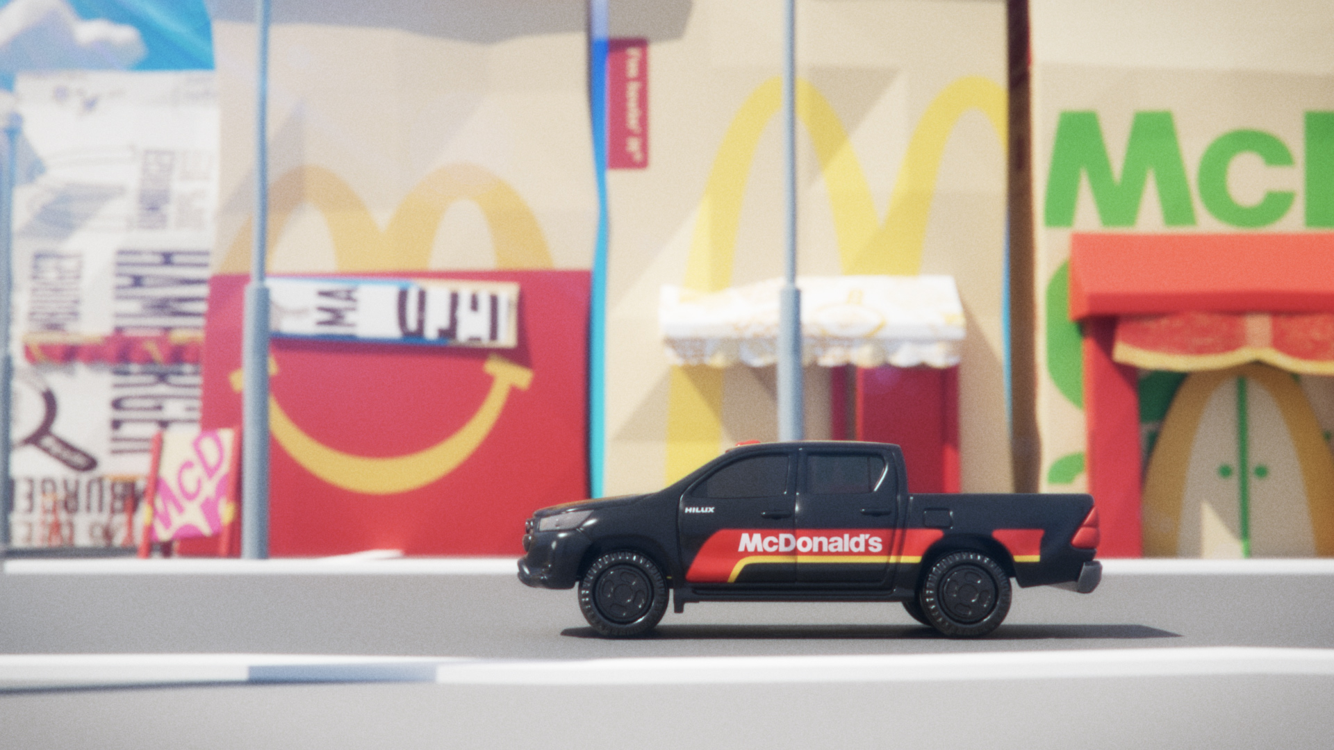 マクドナルドのパッケージで作られた街や、ハンバーガーの山、シェイクの川などが登場するファンタジーな世界で、ハイラックスが力強く滑走していく様子をかわいく、楽しく、かっこよくなるよう表現。