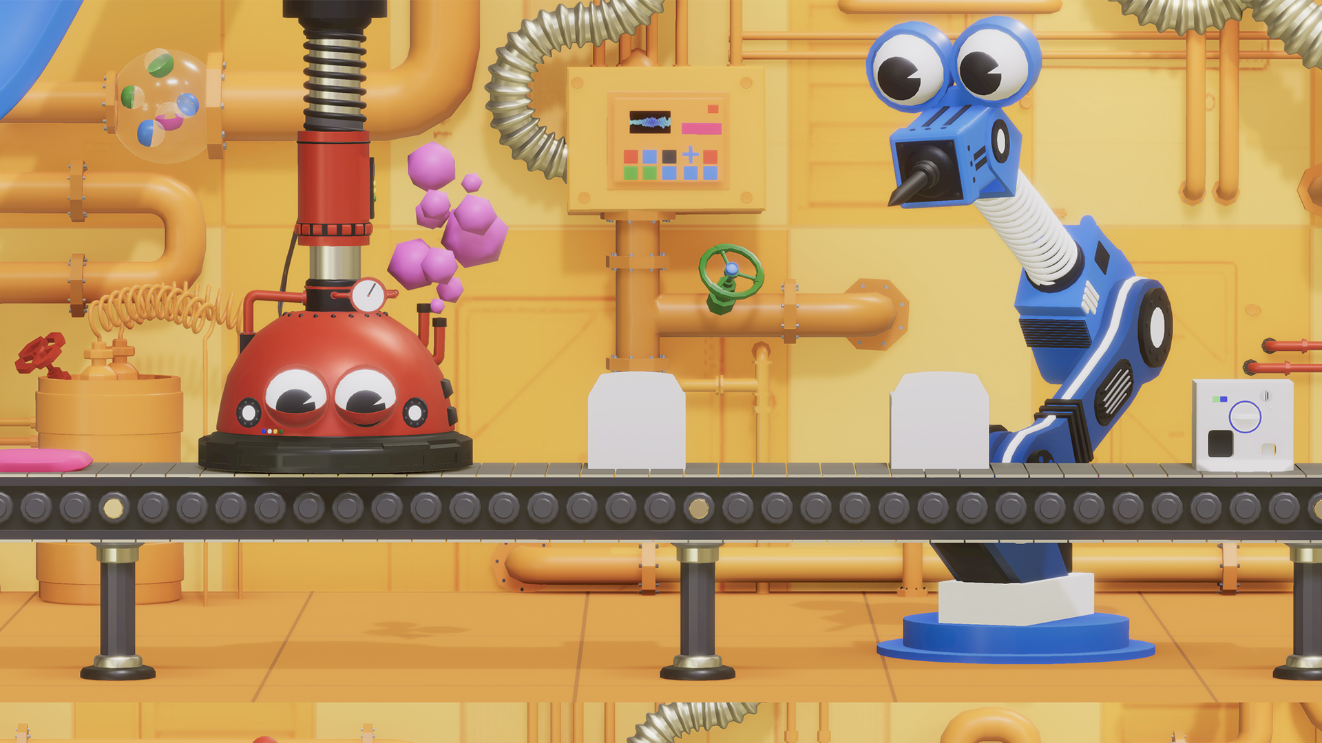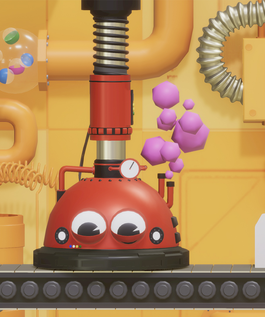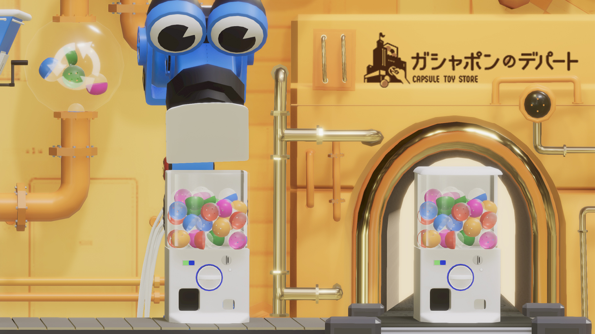 “ガシャポン組立工場” をイメージして、キャラクター化されたロボットたちが筐体を組み立てていく様子をすこしコミカルな親しみやすいアニメーションで表現。
