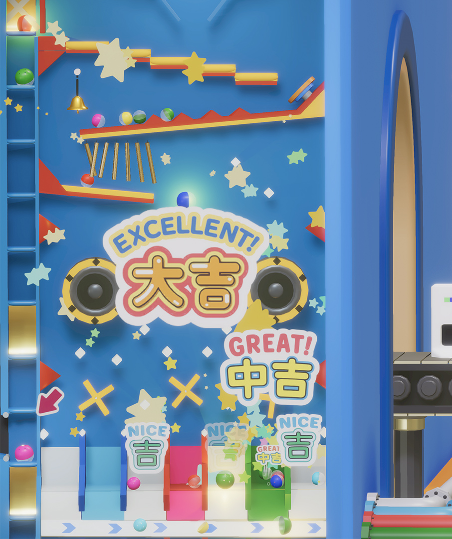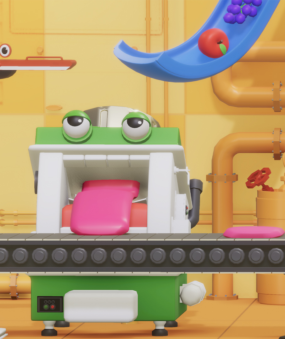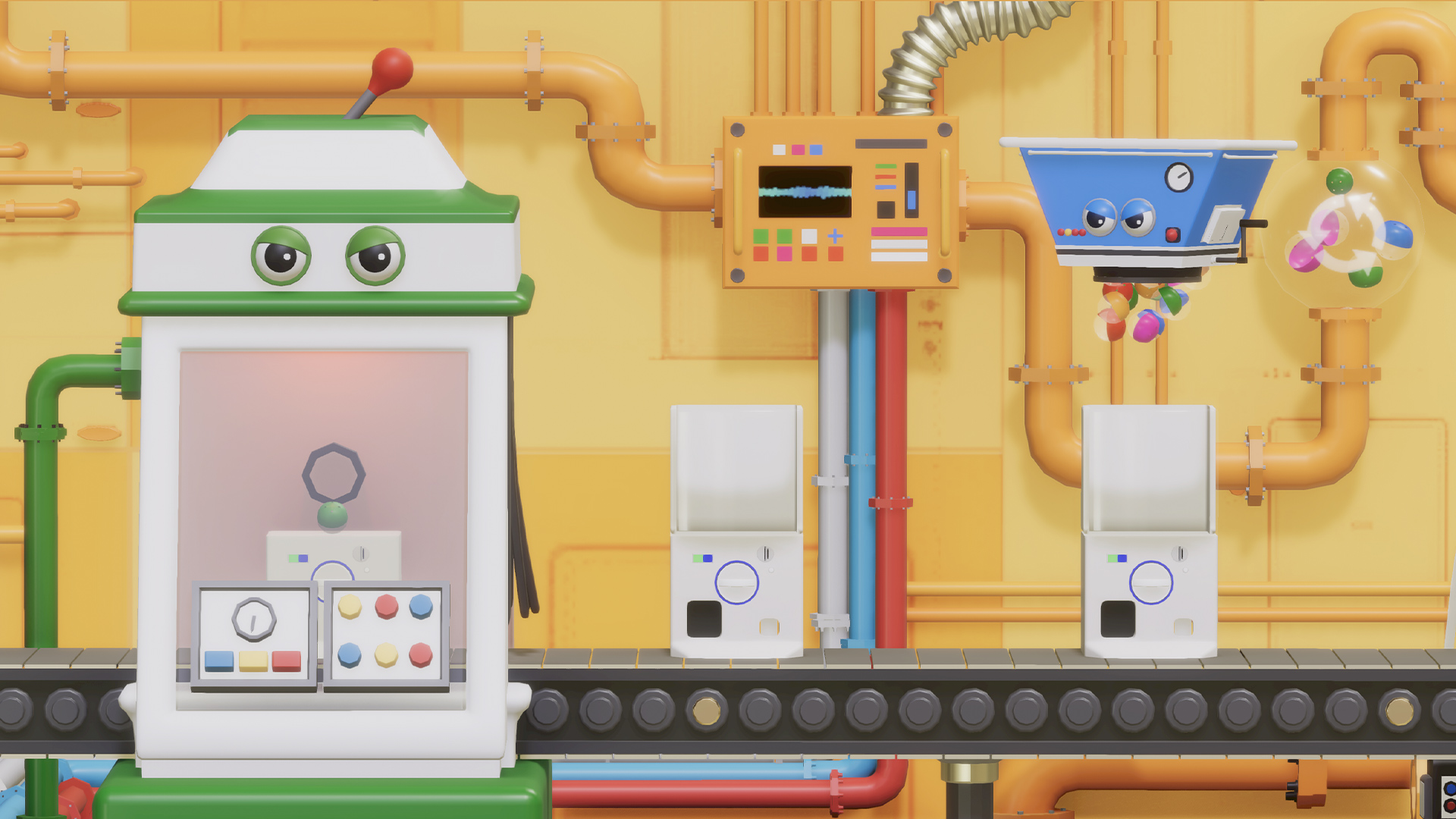 “ガシャポン組立工場” をイメージして、キャラクター化されたロボットたちが筐体を組み立てていく様子をすこしコミカルな親しみやすいアニメーションで表現。