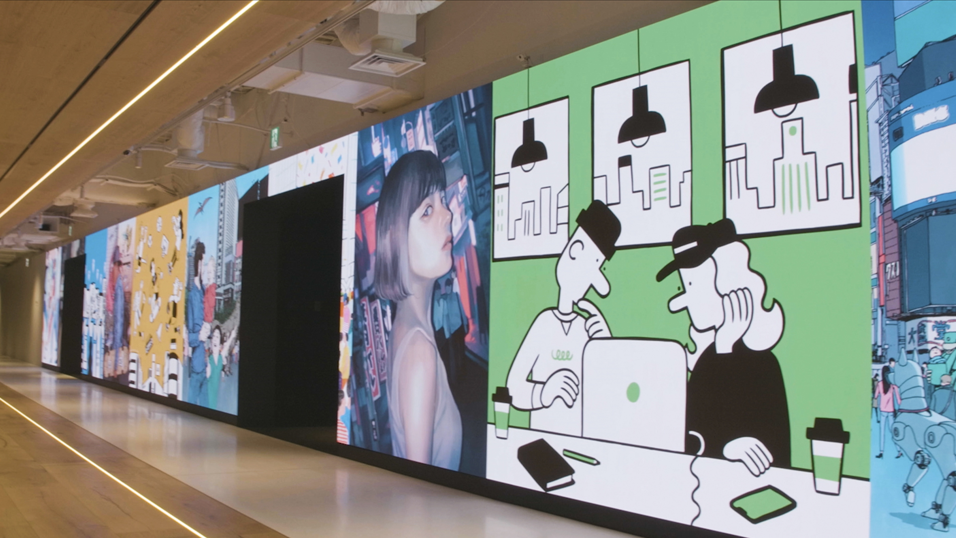 ミクシィグループの新オフィスへの移転にともない、渋谷スクランブルスクエア36Fのエントランス壁面に設置された、横幅24m×高さ2.8mの巨大LED(約16K)へ投影する常設のインスタレーションコンテンツ。
