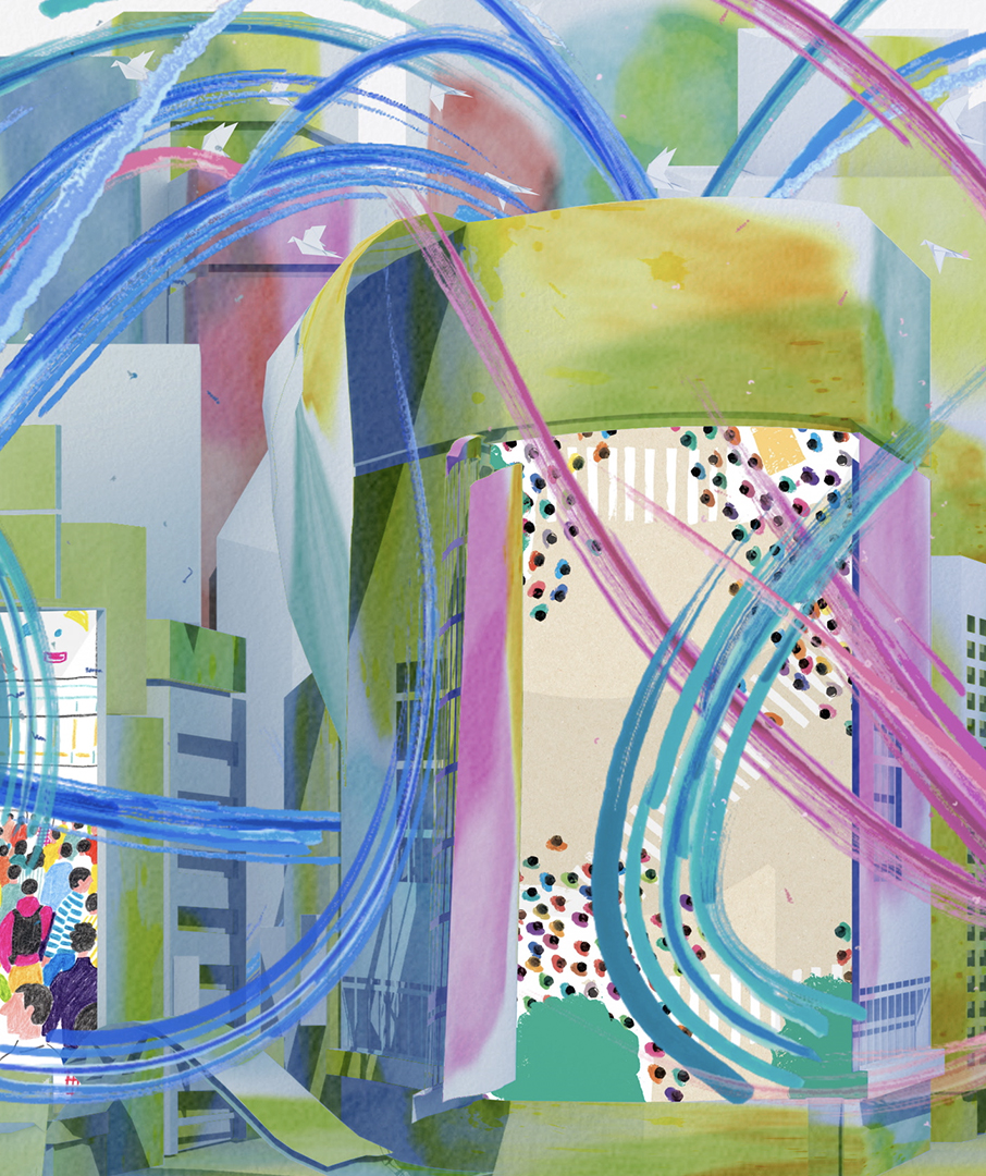 イラストに描かれた多様なコミュニケーションの一つひとつが街全体に彩りを与え、一見、無機質で色味のない街がカラフルに染まっていきます。