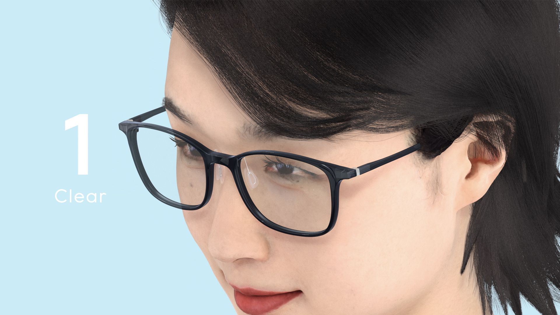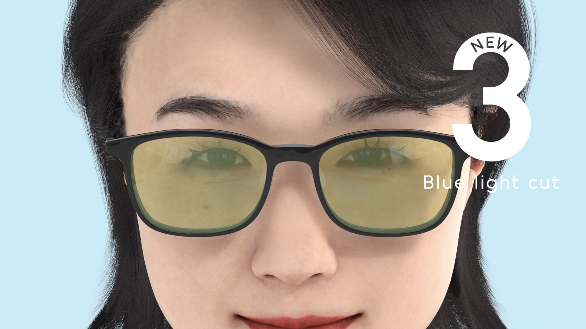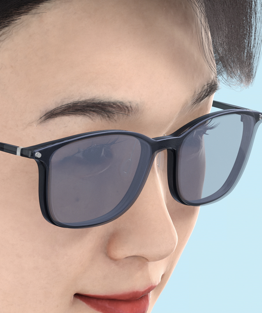 通常レンズ、サングラス、ブルーライトカットレンズの3種類のレンズを付け替えることができる特徴について、3つのアングルを音とシンクロさせて繰り返し見せることで軽快に表現。