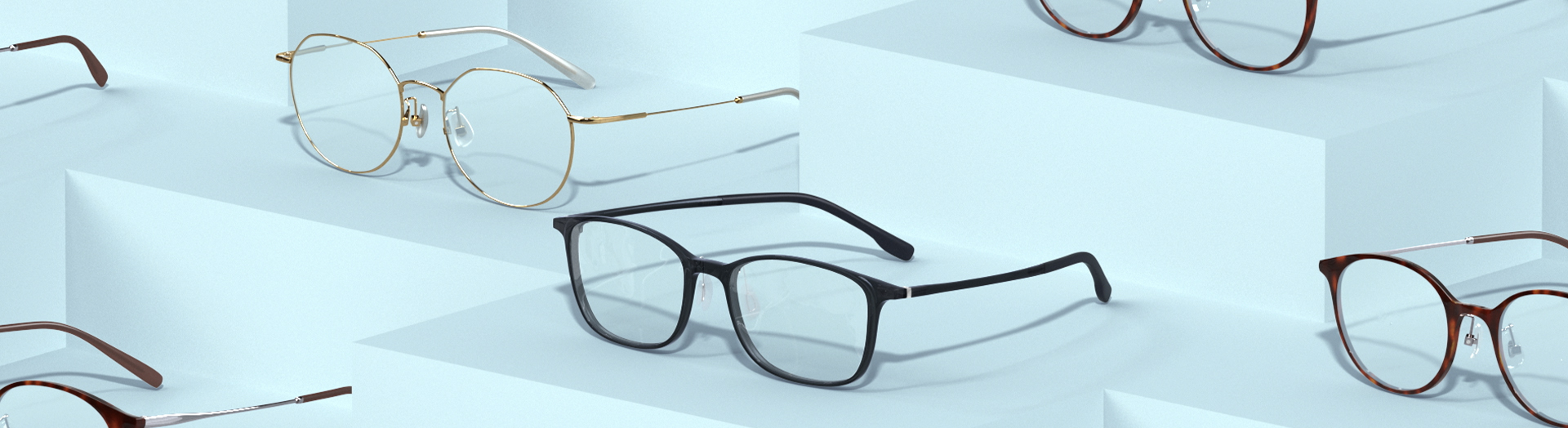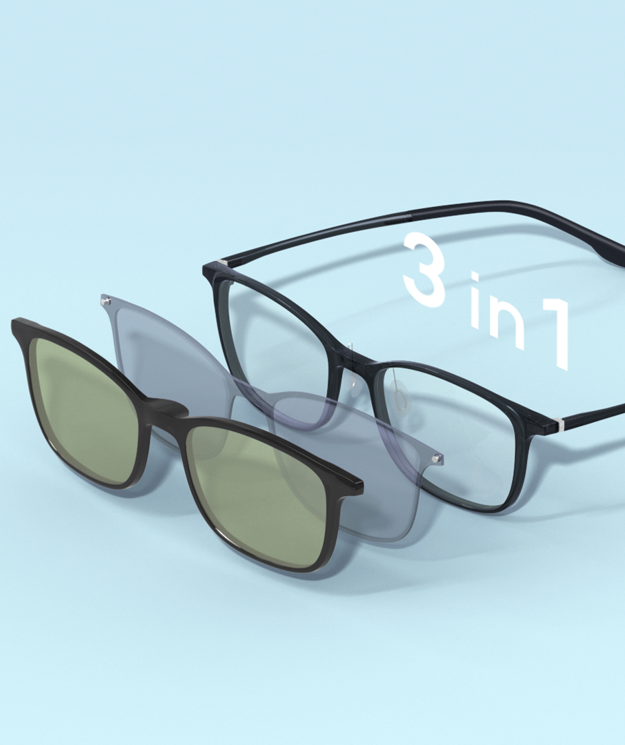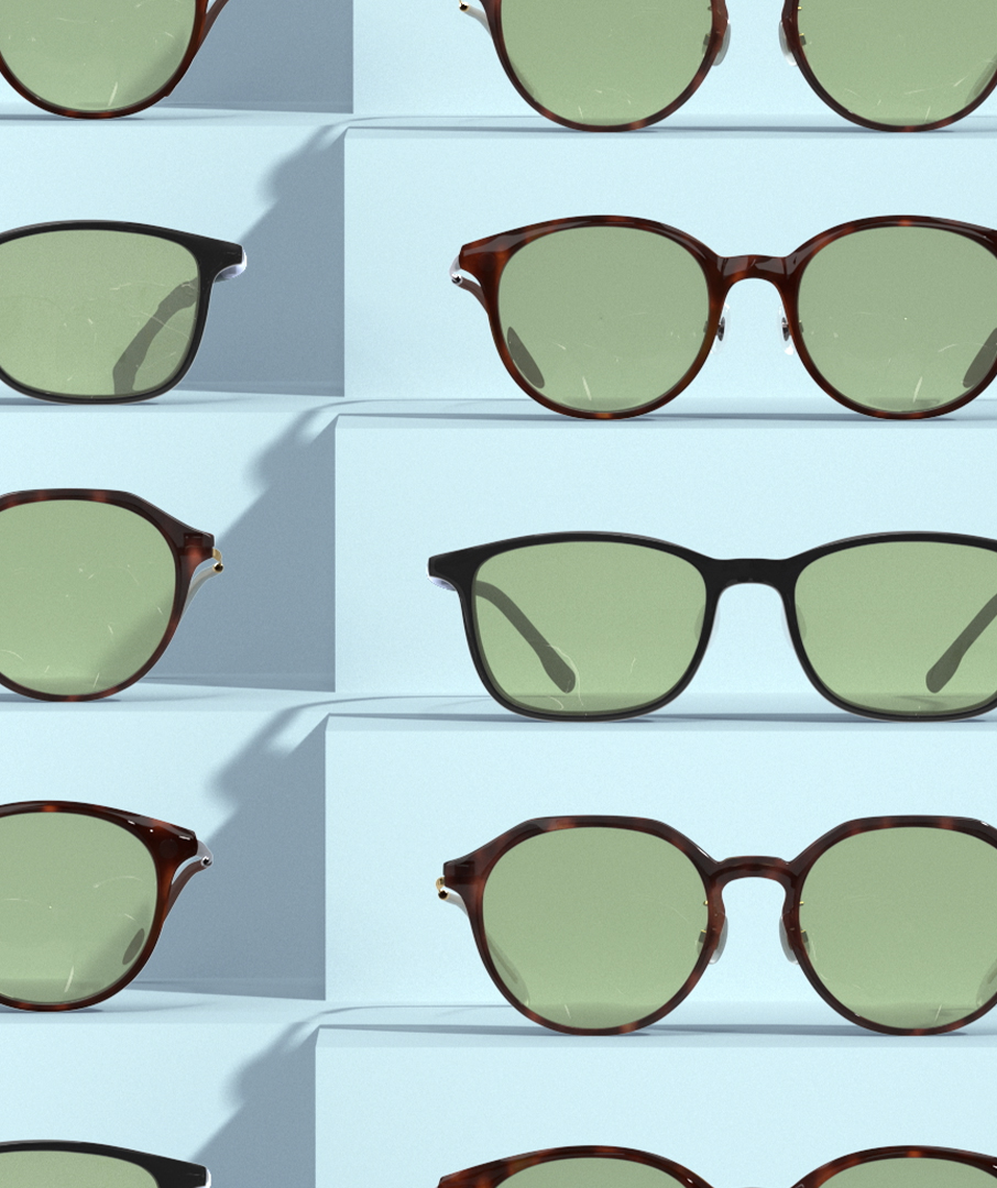 通常レンズ、サングラス、ブルーライトカットレンズの3種類のレンズを付け替えることができる特徴について、3つのアングルを音とシンクロさせて繰り返し見せることで軽快に表現。
