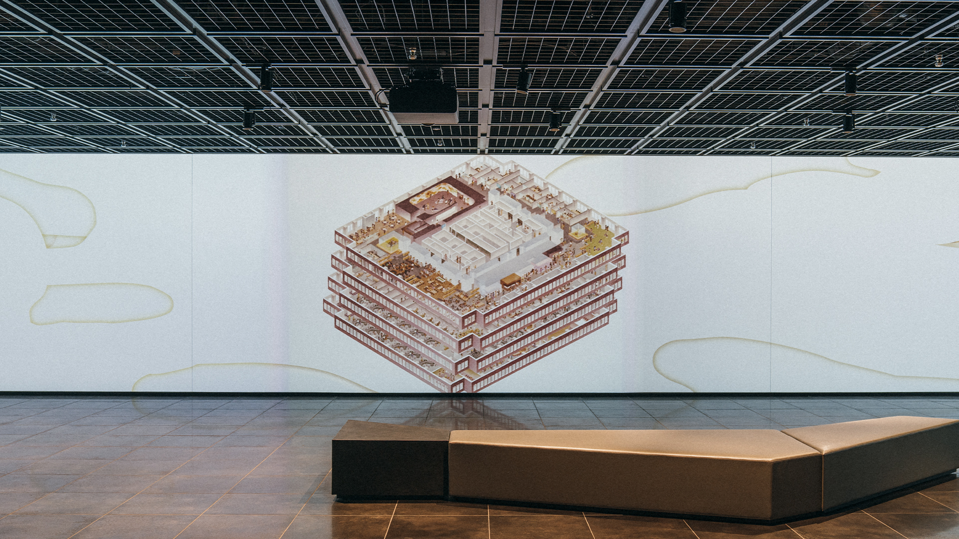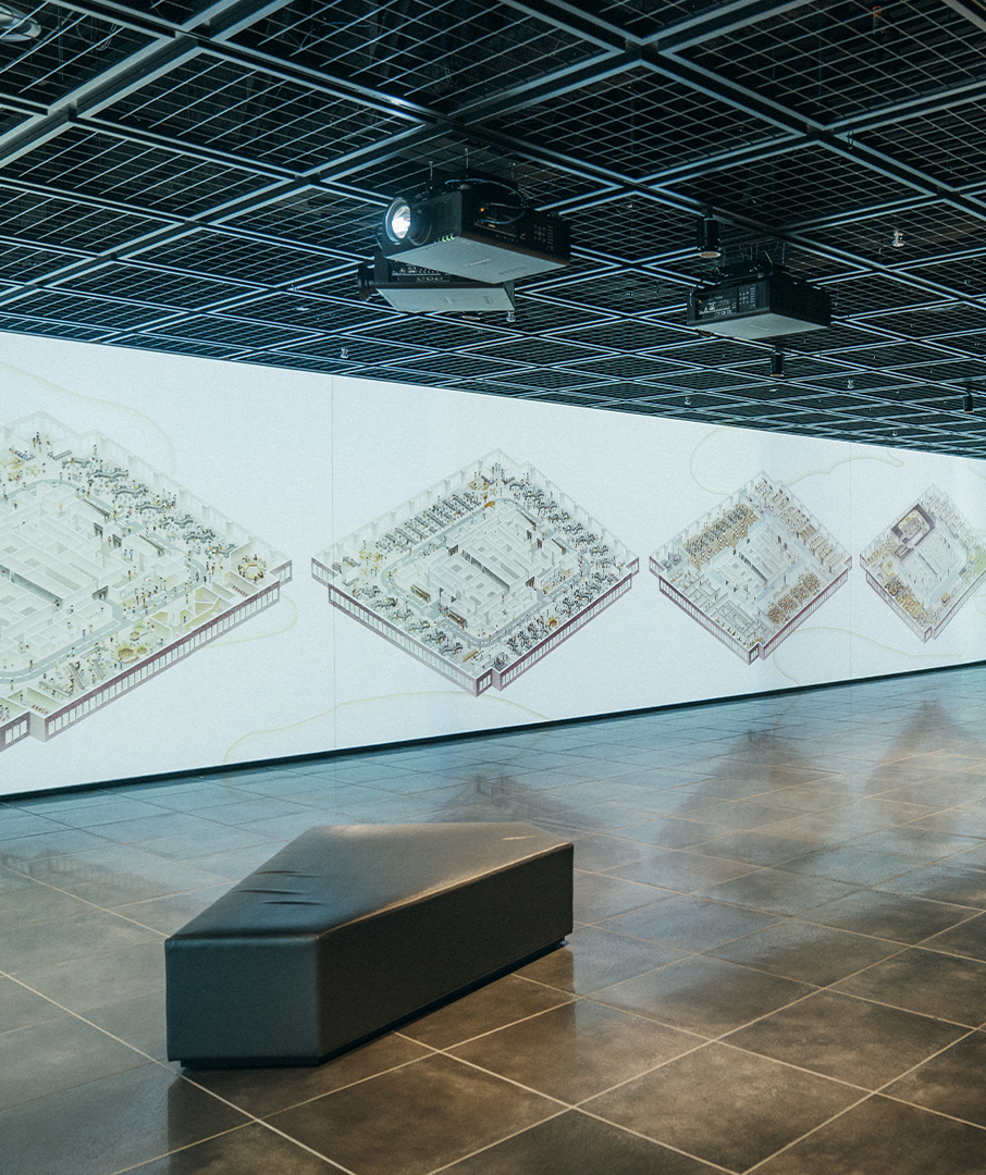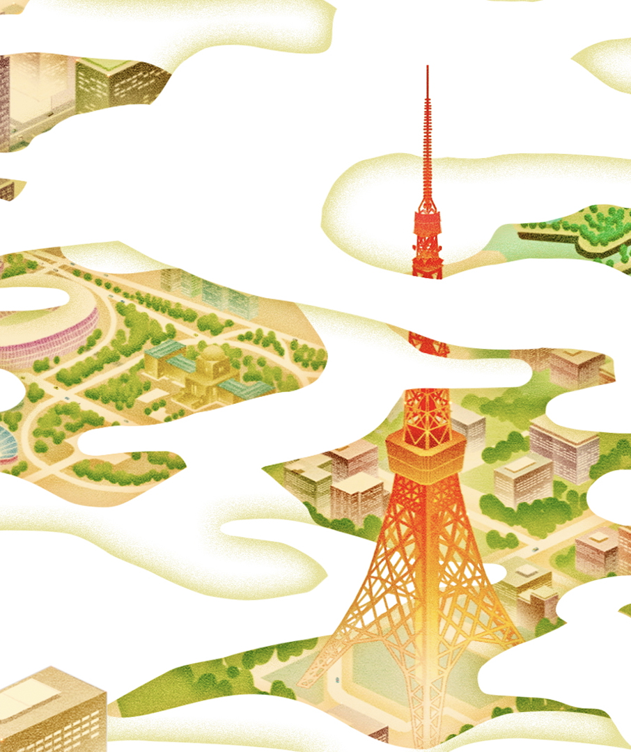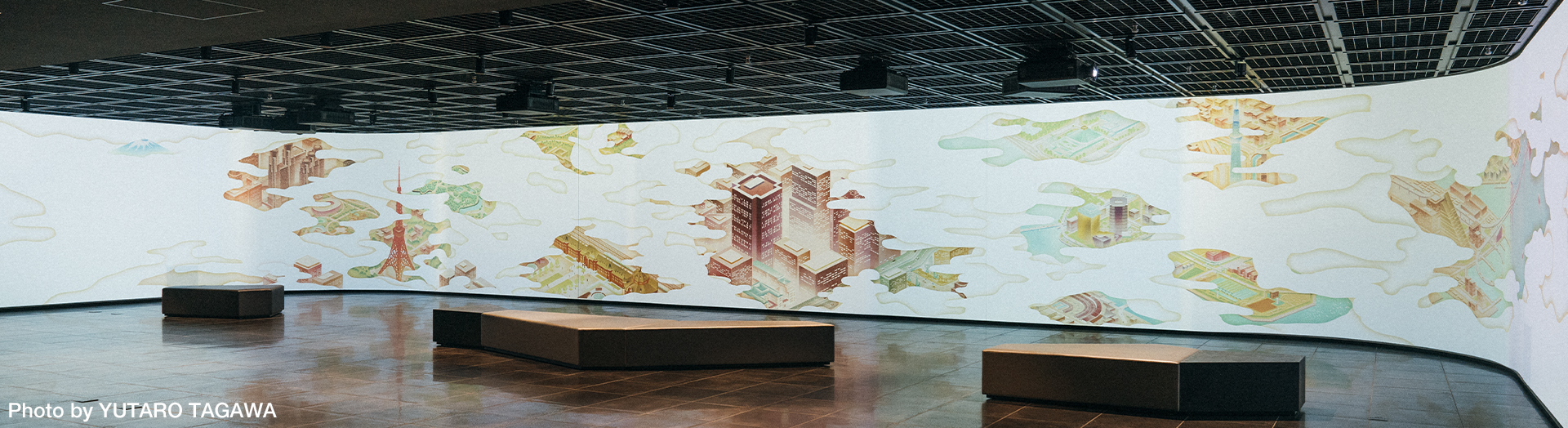 そこに映し出される、日本橋の本社オフィスビルを中心とした東京の風景でお客さんを迎えます。