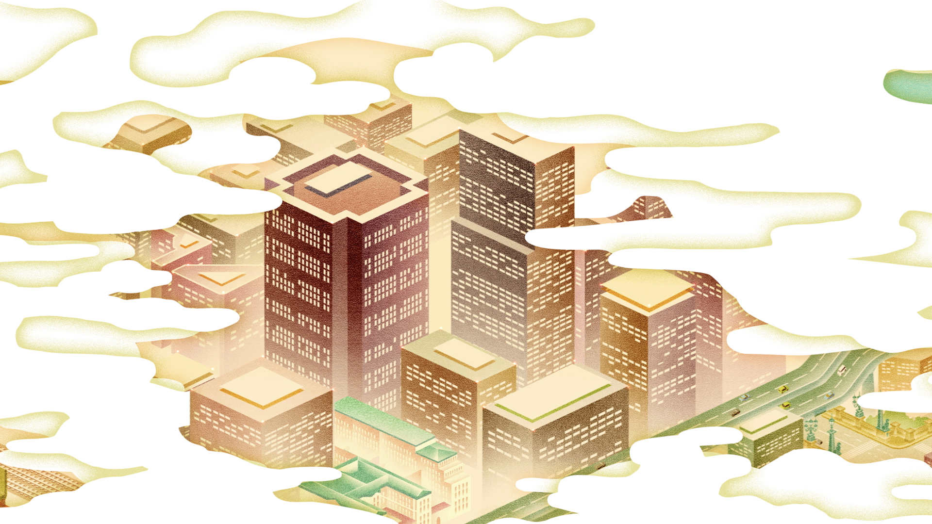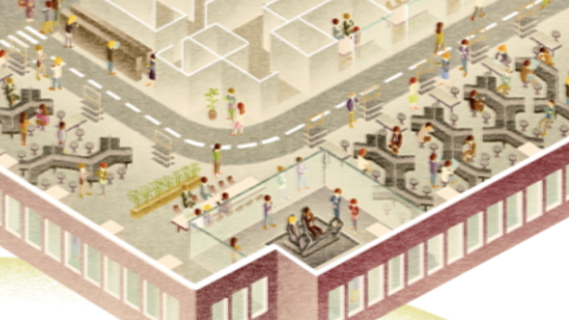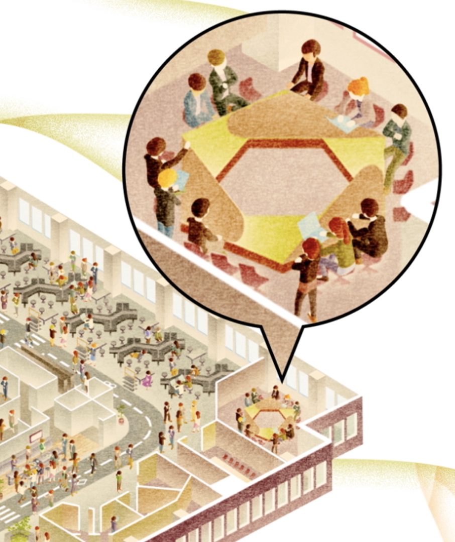 矢野恵司さんのイラストの緻密なタッチを生かし、4フロアそれぞれのテーマに合わせて活気のある社内風景を描きました。