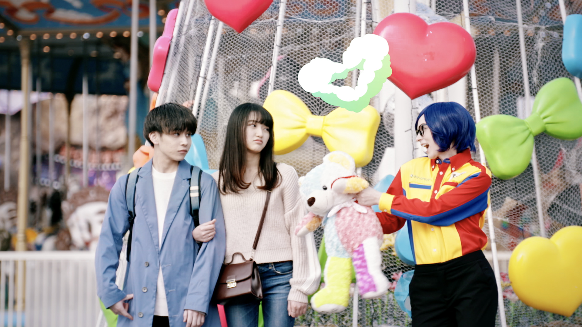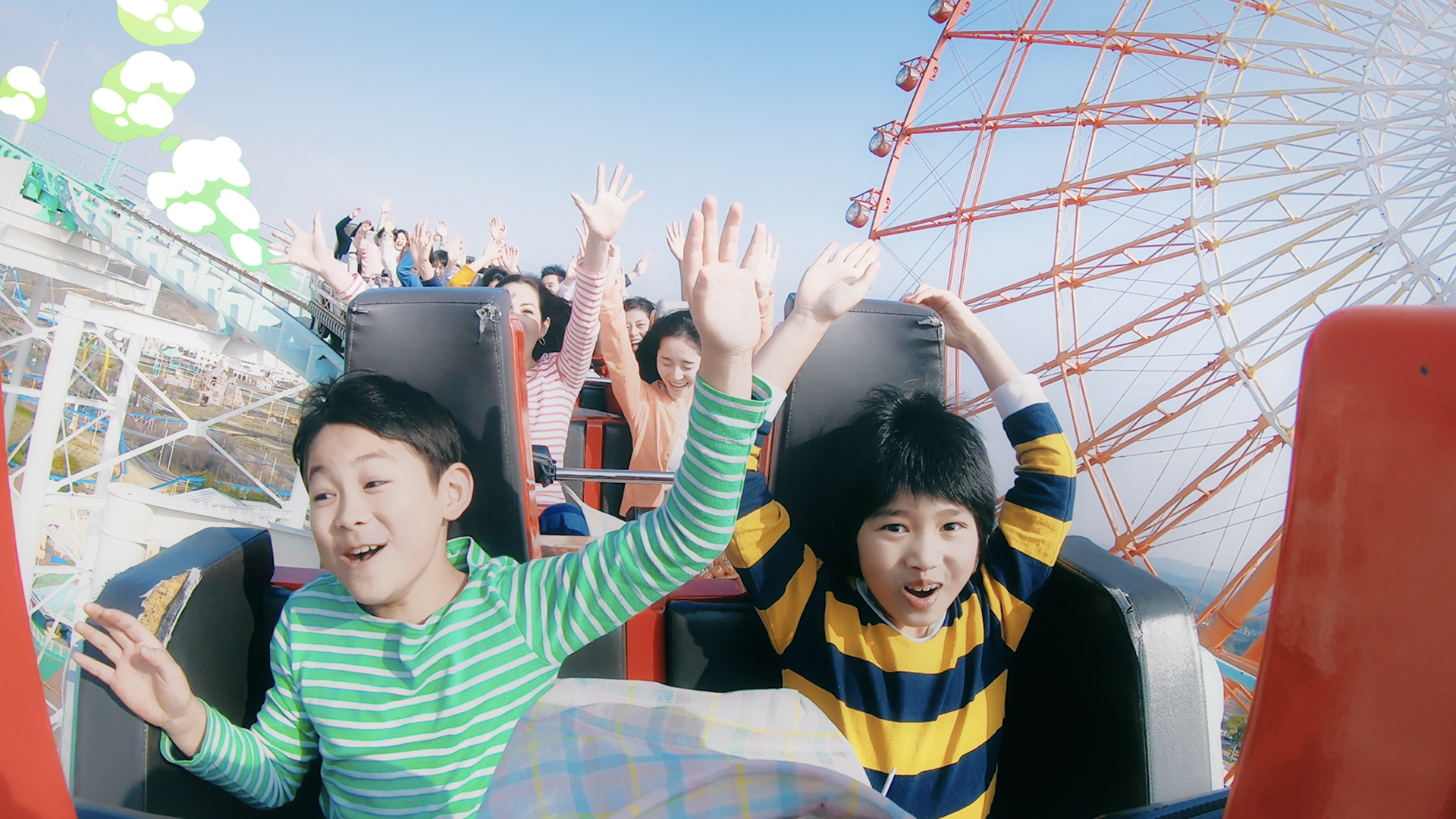 また、遊園地の営業も平行しての撮影でしたので大変でしたが、グリーンランドでの撮影はとても楽しく、キャスト・エキストラ・撮影スタッフ、みんな笑顔で、終始笑いの絶えない現場でした。