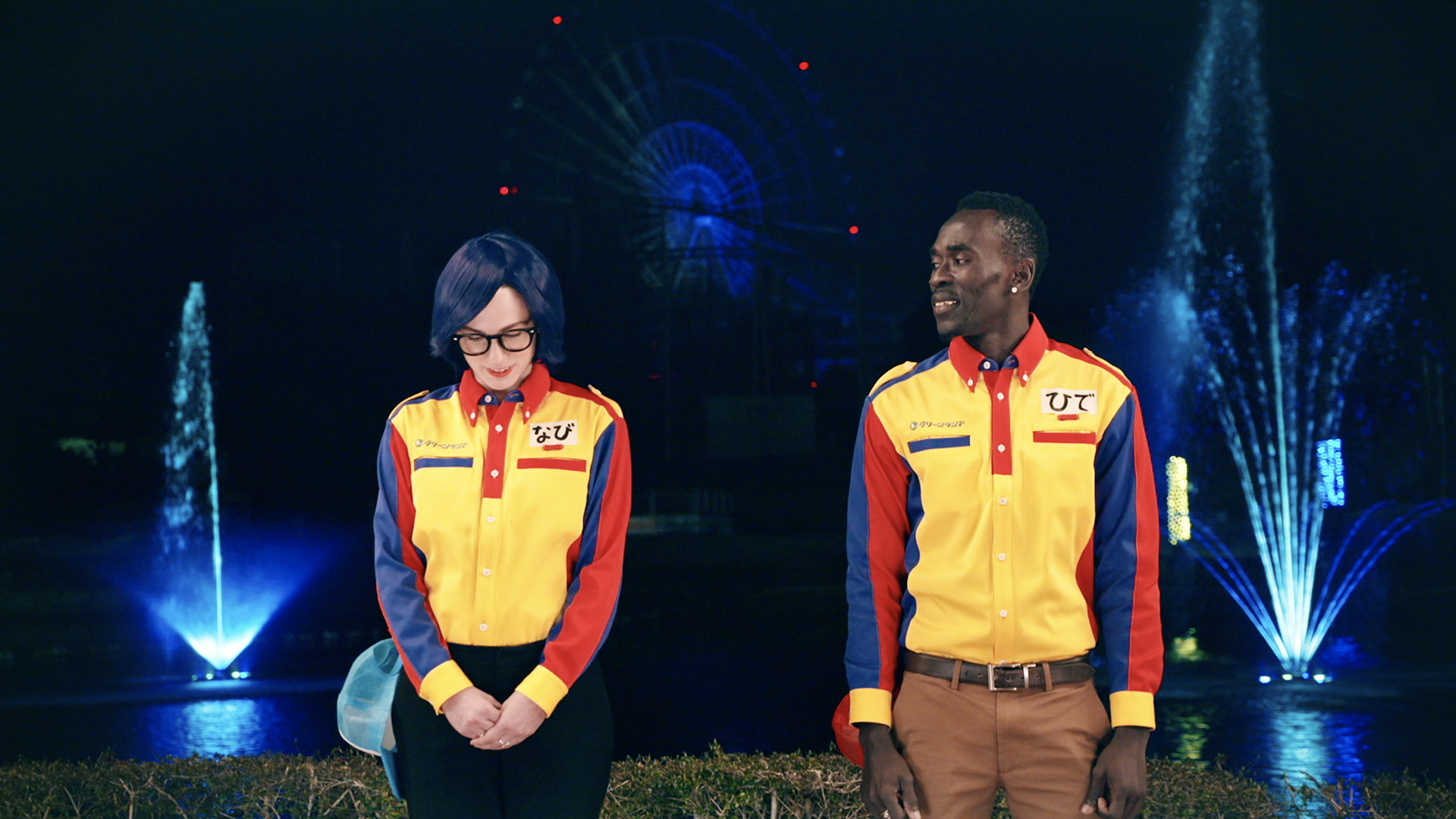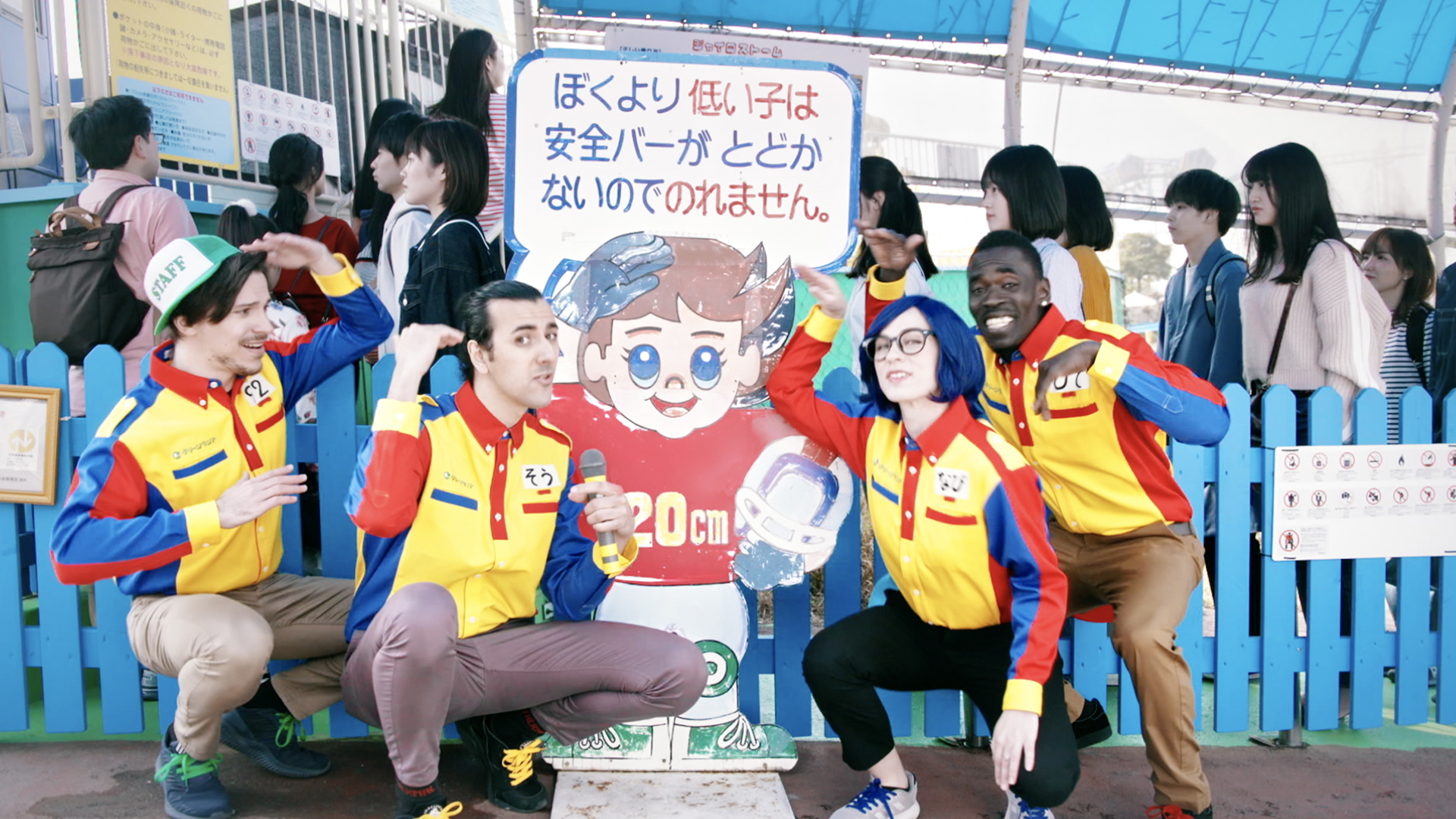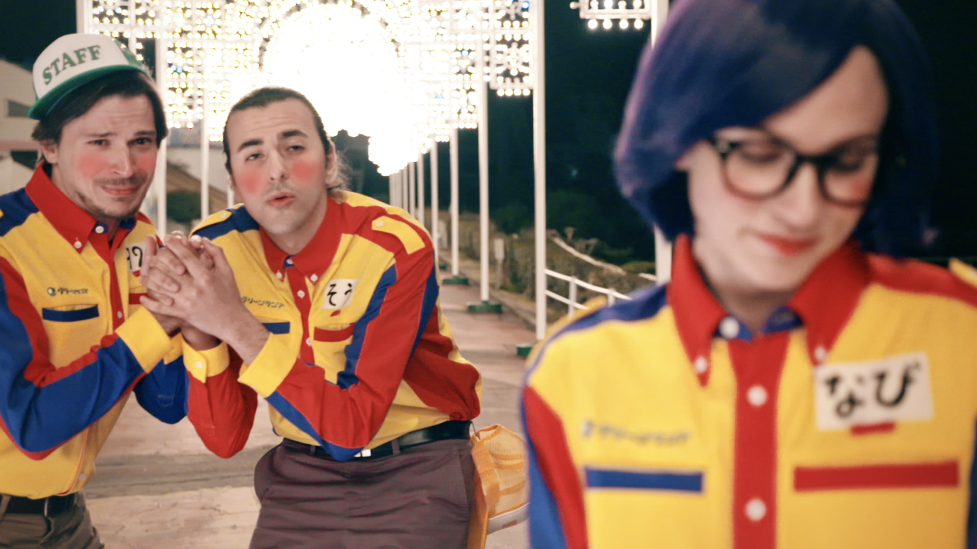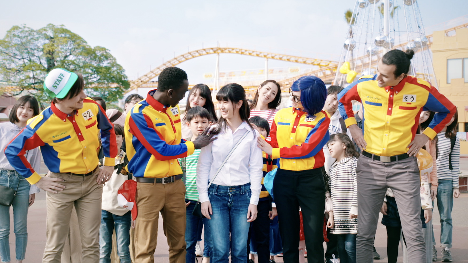 メンバー扮する歌好きで陽気なグリーランドスタッフを、外国人キャストが熱演。