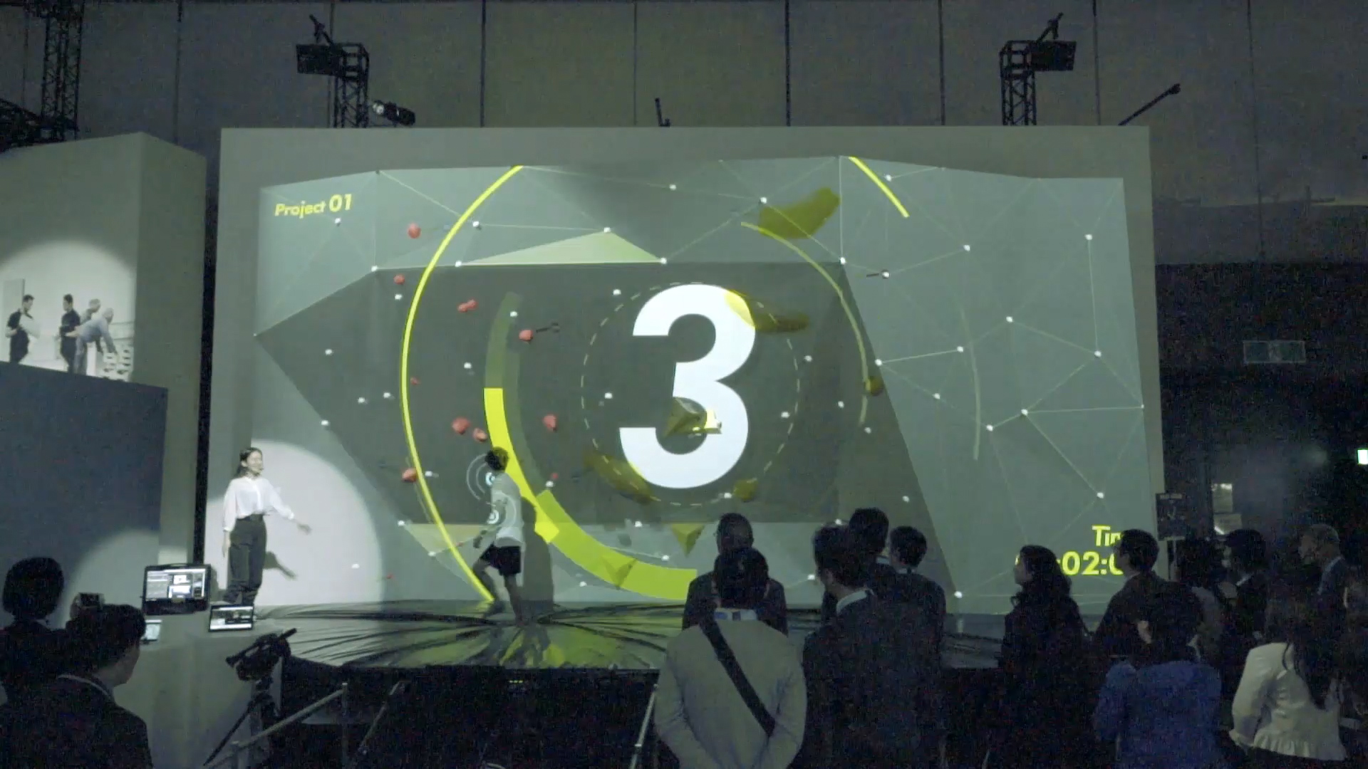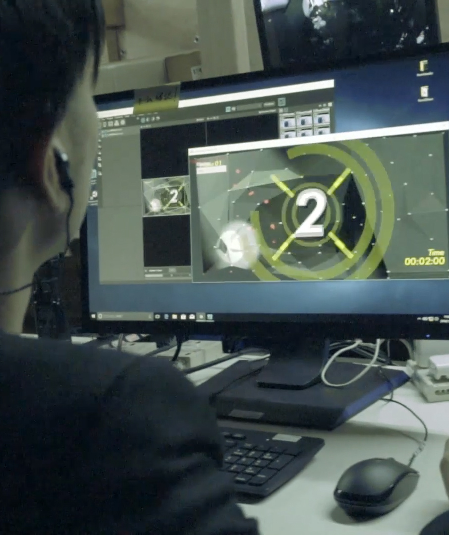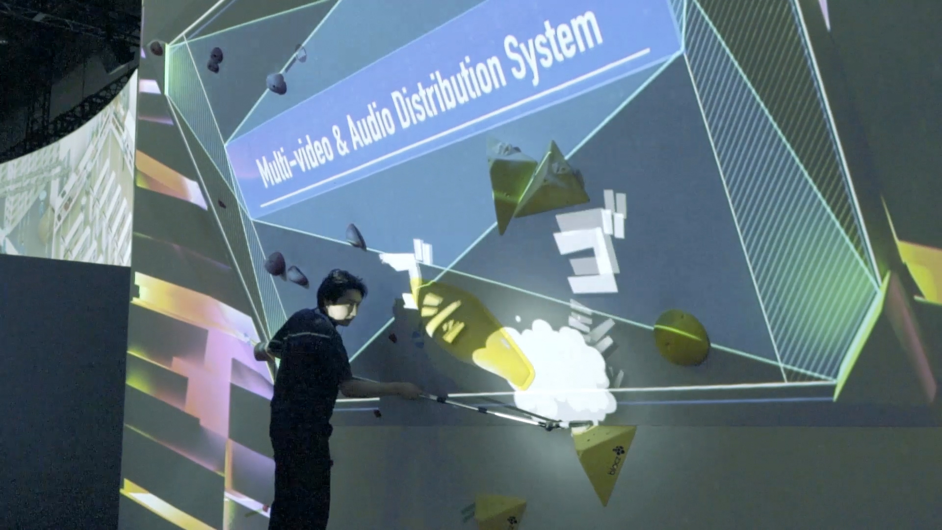 最新のテクノロジーを効果的に訴求するだけでなく、どデカい壁を使った迫力の映像でボルダリング競技の魅力を高める演出を実現するため、プリレンダー映像とジェネラティブCGを組み合わせたハイブリッドな映像表現を行いました。