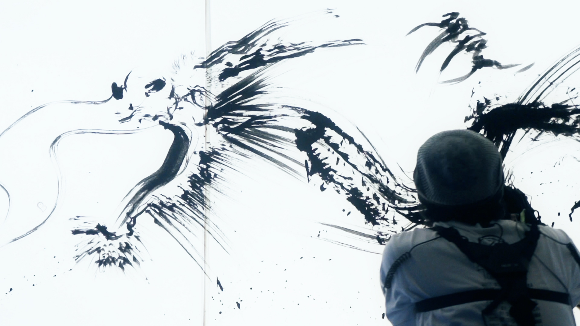普段、墨絵を見るだけでは感じることのできない、まるでその場で作家が描いているような臨場感と迫力のある全く新しい墨絵の姿を体感していただける作品です。
