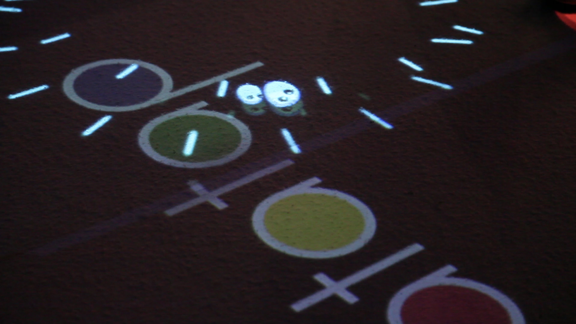 楽器を叩きながらフロアを走りまわると、楽器の音がキャラクターとなって飛び出し、他の音たちと床面を泳ぎまわります。仲間と同時に楽器を鳴らすと、飛び出したキャラクターが合体し、他のキャラクターたちを追いかけます。