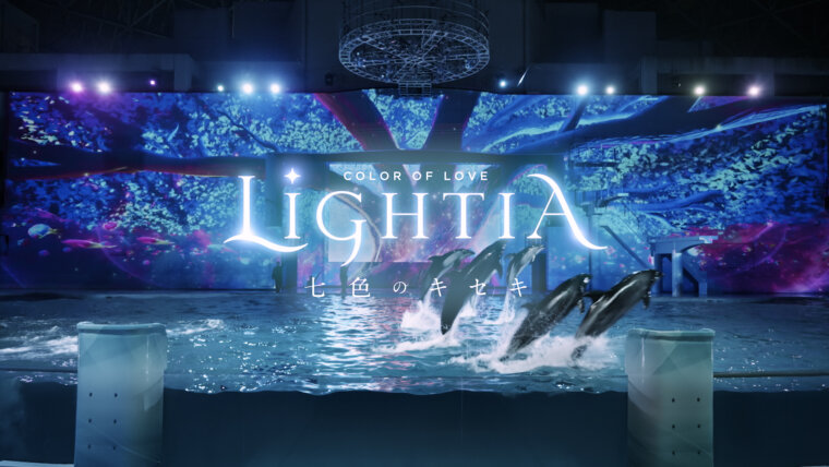 LIGHTIA – a night performance at Yokohama Hakkeijima Sea Paradise featuring synchronized dolphins, visuals, lighting, sound, and fountains. We were responsible for creating the interval and finale visuals for the July 2025 renewal.